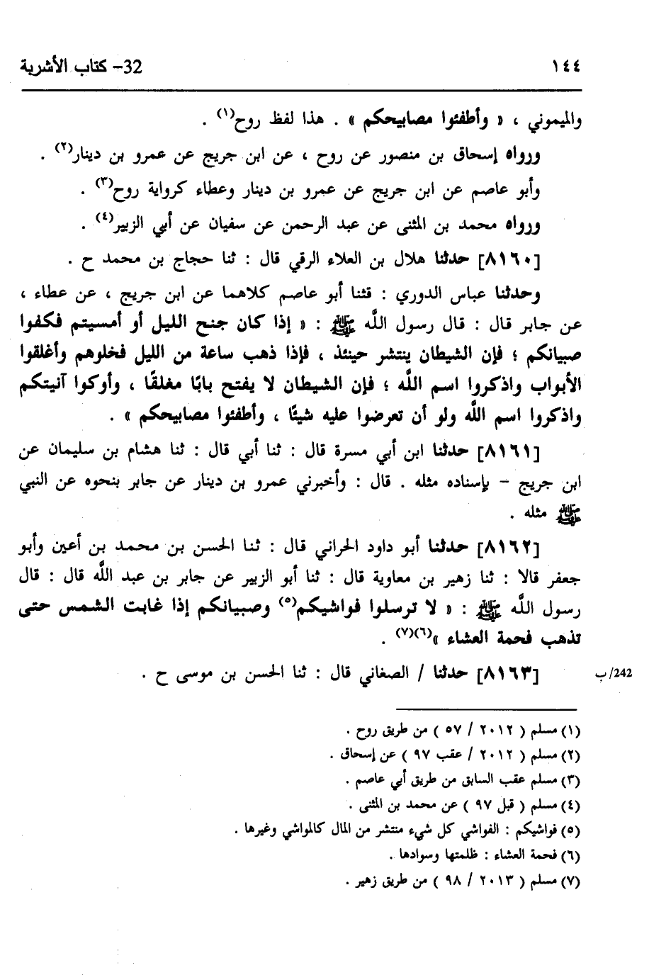 8160 - حَدَّثَنَا هِلَالُ بْنُ الْعَلَاءِ الرَّقِّيُّ، قَالَ: ثَنَا حَجَّاجُ بْنُ مُحَمَّدٍ، ح، وَحَدَّثَنَا عَبَّاسٌ الدُّورِيُّ، قَثَنَا أَبُو عَاصِمٍ، كِلَاهُمَا، عَنِ ابْنِ جُرَيْجٍ، عَنْ عَطَاءٍ، عَنْ جَابِرٍ، قَالَ: قَالَ رَسُولُ اللَّهِ صَلَّى اللهُ عَلَيْهِ وَسَلَّمَ: «§إِذَا كَانَ جُنْحُ اللَّيْلِ، أَوْ أَمْسَيْتُمْ، فَكُفُّوا صِبْيَانَكُمْ، فَإِنَّ الشَّيْطَانَ يَنْتَشِرُ حِينَئِذٍ، فَإِذَا ذَهَبَ سَاعَةٌ مِنَ اللَّيْلِ، فَخَلُّوهُمْ، وَأَغْلِقُوا الْأَبْوَابَ، وَاذْكُرُوا اسْمَ اللَّهِ، فَإِنَّ الشَّيْطَانَ لَا يُفْتَحُ بَابًا مُغْلَقًا، وَأَوْكُوا آنِيَتَكُمْ، وَاذْكُرُوا اسْمَ اللَّهِ، وَلَوْ أَنْ تَعْرُضُوا عَلَيْهِ شَيْئًا، وَأَطْفِئُوا مَصَابِيحَكُمْ» ،