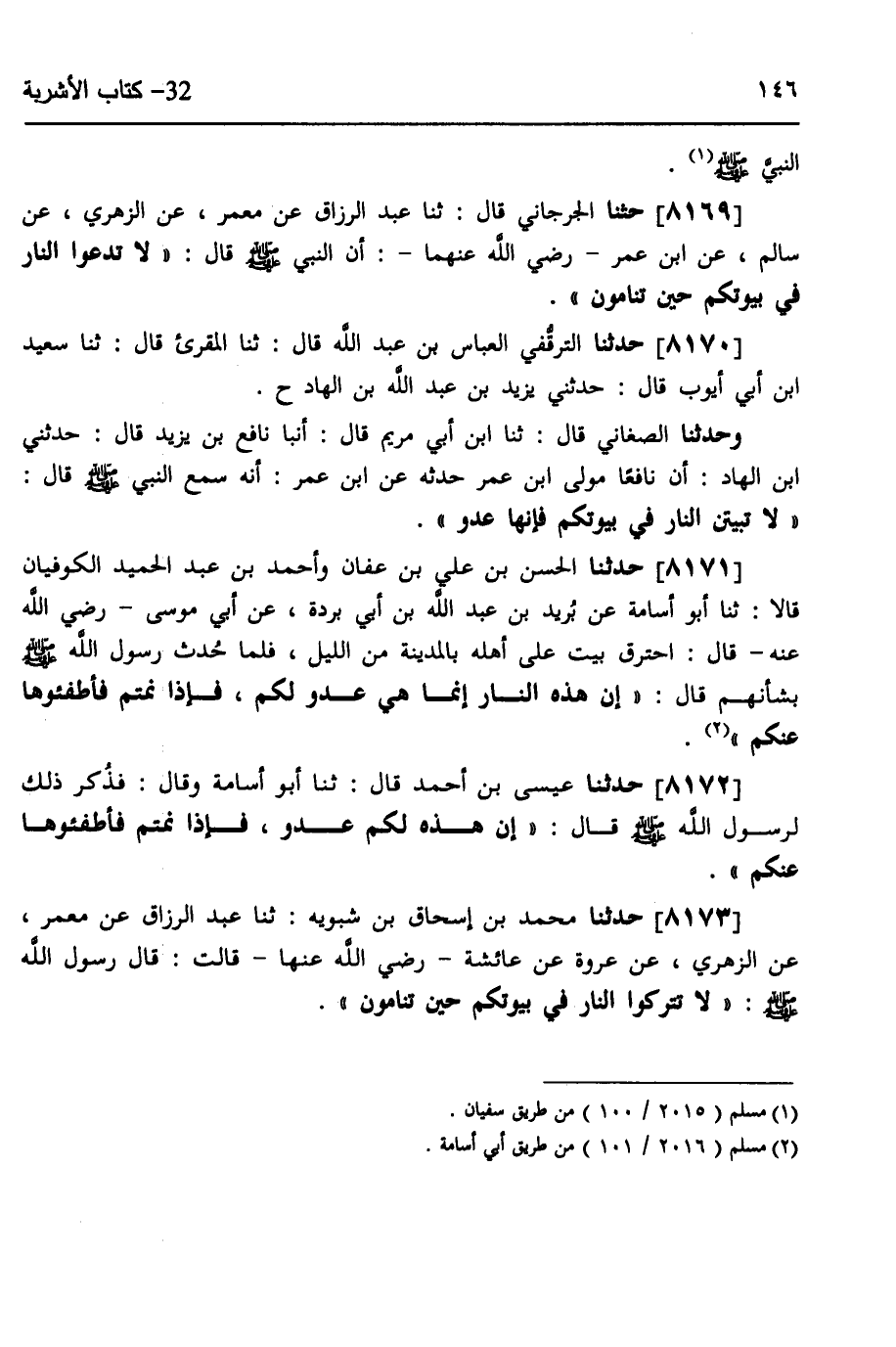 حثنا الْجُرْجَانِيُّ، قَالَ: ثَنَا عَبْدُ الرَّزَّاقِ، عَنْ مَعْمَرٍ، عَنِ الزُّهْرِيِّ، عَنْ سَالِمٍ، عَنِ ابْنِ عُمَرَ رَضِيَ اللَّهُ عَنْهُمَا، أَنَّ النَّبِيَّ صَلَّى اللهُ عَلَيْهِ وَسَلَّمَ، قَالَ: «§لَا تَدَعُوا النَّارَ فِي بُيُوتِكُمْ، حِينَ تَنَامُونَ»
