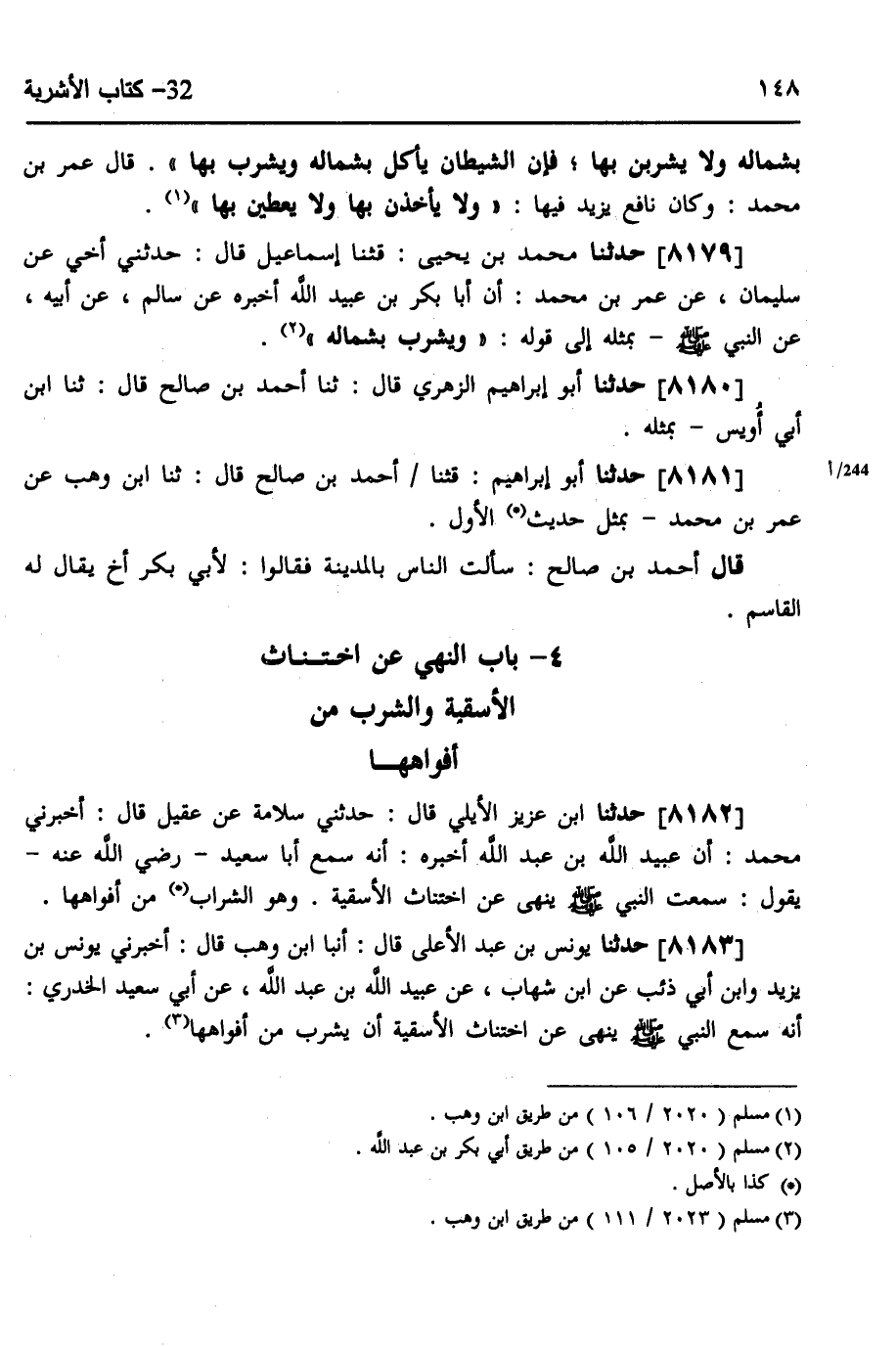 8183 - حَدَّثَنَا يُونُسُ بْنُ عَبْدِ الْأَعْلَى، قَالَ: أَنْبَأَ ابْنُ وَهْبٍ، قَالَ: أَخْبَرَنِي يُونُسُ بْنُ يَزِيدَ، وَابْنُ أَبِي ذِئْبٍ، عَنِ ابْنِ شِهَابٍ، عَنْ عُبَيْدِ اللَّهِ بْنِ عَبْدِ اللَّهِ، عَنْ أَبِي سَعِيدٍ الْخُدْرِيِّ، أَنَّهُ سَمِعَ النَّبِيَّ صَلَّى اللهُ عَلَيْهِ وَسَلَّمَ، «§يَنْهَى عَنِ اخْتِنَاثِ الْأَسْقِيَةِ، أَنْ يَشْرَبَ، مِنْ أَفْوَاهِهَا» -[149]-،