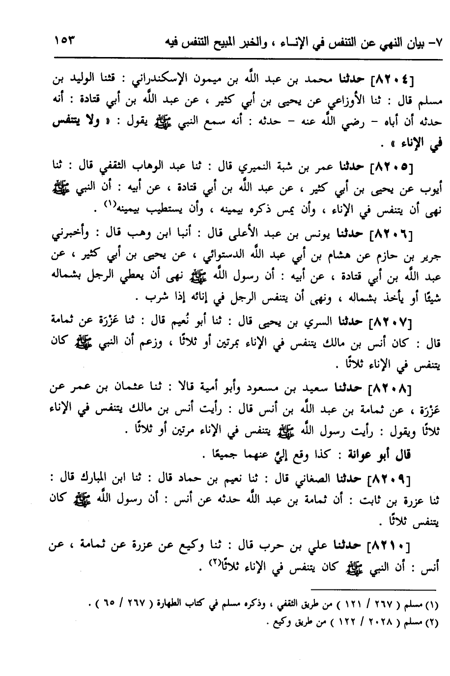 8207 - حَدَّثَنَا السَّرِيُّ بْنُ يَحْيَى، قَالَ: ثَنَا أَبُو نُعَيْمٍ، قَالَ: ثَنَا عَزْرَةُ، عَنْ ثُمَامَةَ، قَالَ: كَانَ أَنَسُ بْنُ مَالِكٍ يَتَنَفَّسُ فِي الْإِنَاءِ بِمَرَّتَيْنِ، أَوْ ثَلَاثًا، وَزَعَمَ أَنَّ §النَّبِيَّ صَلَّى اللهُ عَلَيْهِ وَسَلَّمَ، كَانَ يَتَنَفَّسُ فِي الْإِنَاءِ ثَلَاثًا "