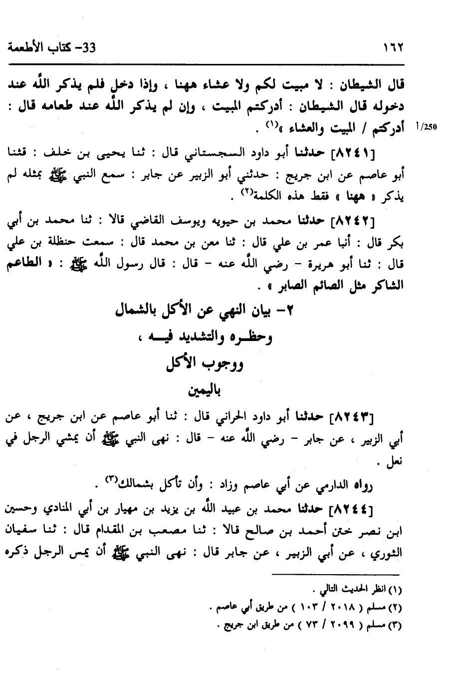 8243 - حَدَّثَنَا أَبُو دَاوُدَ الْحَرَّانِيُّ، قَالَ: ثَنَا أَبُو عَاصِمٍ، عَنِ ابْنِ جُرَيْجٍ، عَنْ أَبِي الزُّبَيْرِ، عَنْ جَابِرٍ رَضِيَ اللَّهُ عَنْهُ، قَالَ: «§نَهَى النَّبِيُّ صَلَّى اللهُ عَلَيْهِ وَسَلَّمَ، أَنْ يَمْشِيَ الرَّجُلُ فِي نَعْلٍ» ، رَوَاهُ الدَّارِمِيُّ، عَنْ أَبِي عَاصِمٍ وَزَادَ: وَأَنْ تَأْكُلَ بِشِمَالِكِ