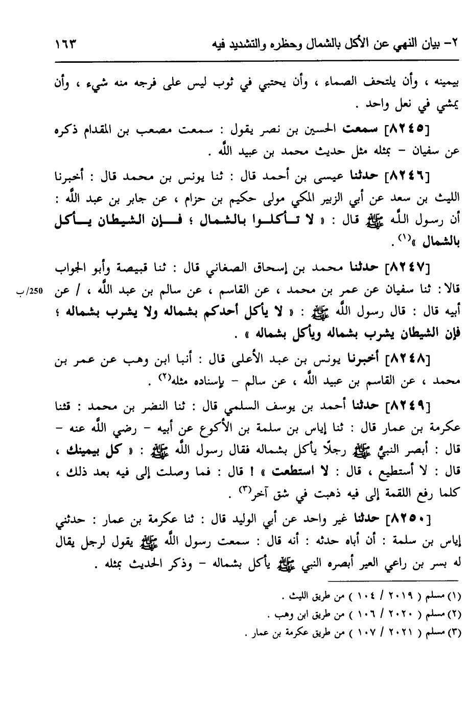 8247 - حَدَّثَنَا مُحَمَّدُ بْنُ إِسْحَاقَ الصَّغَانِيُّ، قَالَ: ثَنَا قَبِيصَةُ، وَأَبُو الْجَوَّابِ، قَالَا: ثَنَا سُفْيَانُ، عَنْ عُمَرَ بْنِ مُحَمَّدٍ، عَنِ الْقَاسِمِ، عَنْ سَالِمِ بْنِ عَبْدِ اللَّهِ، عَنْ أَبِيهِ، قَالَ: قَالَ رَسُولُ اللَّهِ صَلَّى اللهُ عَلَيْهِ وَسَلَّمَ: «§لَا يَأْكُلْ أَحَدُكُمْ بِشِمَالِهِ، وَلَا يَشْرَبْ بِشِمَالِهِ، فَإِنَّ الشَّيْطَانَ يَشْرَبُ بِشِمَالِهِ، وَيَأْكُلُ بِشِمَالِهِ» ،