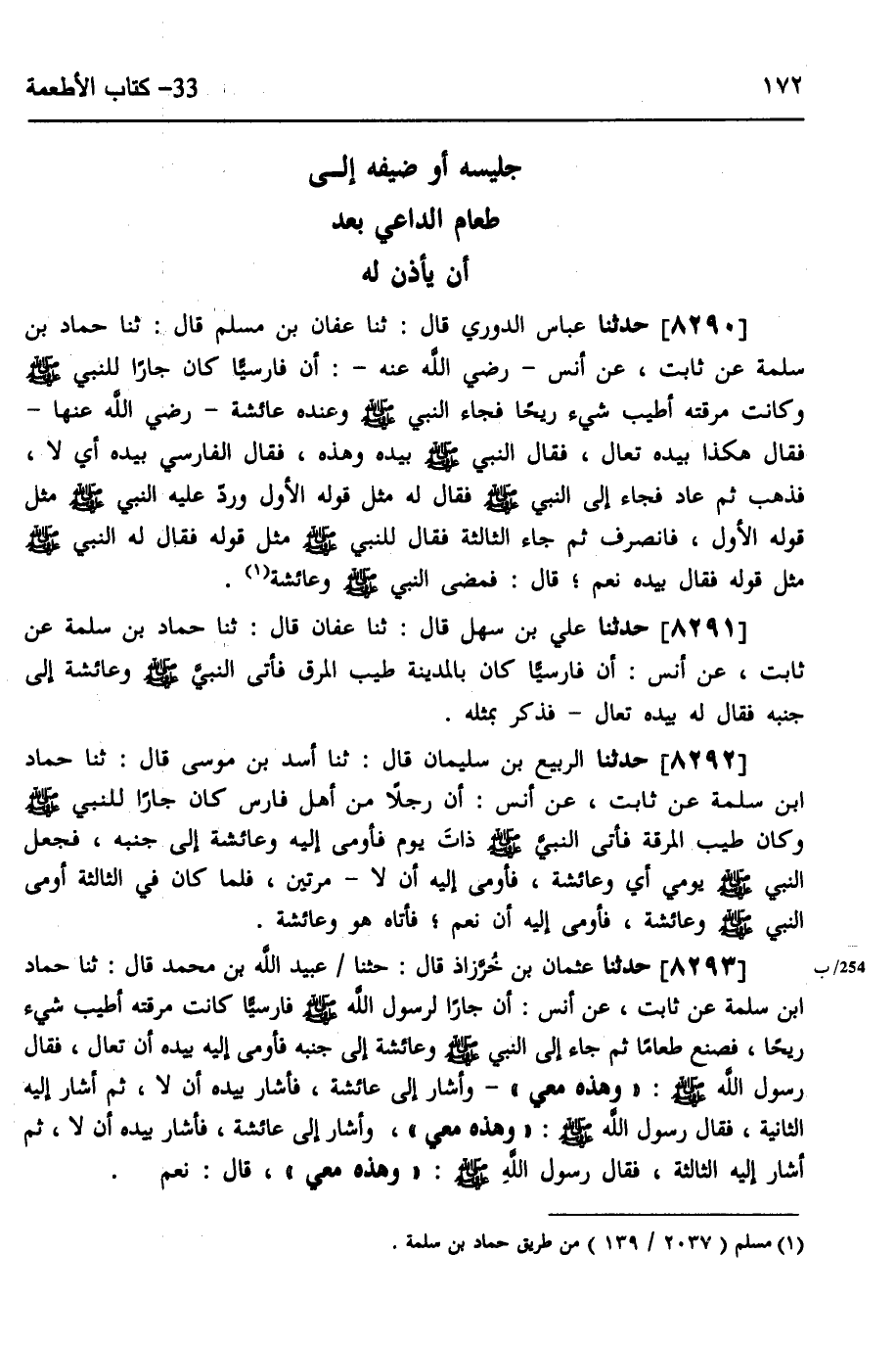 8293 - حَدَّثَنَا عُثْمَانُ بْنُ خُرَّزَاذَ، قَالَ: حثنا عُبَيْدُ اللَّهِ بْنُ مُحَمَّدٍ، قَالَ: ثَنَا حَمَّادُ بْنُ سَلَمَةَ، عَنْ ثَابِتٍ، عَنْ أَنَسٍ، أَنَّ §جَارًا، لِرَسُولِ اللَّهِ صَلَّى اللهُ عَلَيْهِ وَسَلَّمَ، فَارِسِيًّا كَانَتْ مَرَقَتَهُ أَطْيَبَ شَيْءٍ رِيحًا، فَصَنَعَ طَعَامًا، ثُمَّ جَاءَ إِلَى النَّبِيِّ صَلَّى اللهُ عَلَيْهِ وَسَلَّمَ، وَعَائِشَةُ إِلَى جَنْبِهِ، فَأَوْمَى إِلَيْهِ بِيَدِهِ أَنْ تَعَالَ، فَقَالَ رَسُولُ اللَّهِ صَلَّى اللهُ عَلَيْهِ وَسَلَّمَ: «وَهَذِهِ مَعِي» ، وَأَشَارَ إِلَى عَائِشَةَ، فَأَشَارَ بِيَدِهِ أَنْ لَا، ثُمَّ أَشَارَ إِلَيْهِ الثَّانِيَةَ، فَقَالَ: رَسُولُ اللَّهِ صَلَّى اللهُ عَلَيْهِ وَسَلَّمَ: «وَهَذِهِ مَعِي» ، وَأَشَارَ إِلَى عَائِشَةَ، فَأَشَارَ بِيَدِهِ أَنْ لَا، ثُمَّ أَشَارَ إِلَيْهِ الثَّالِثَةَ، فَقَالَ رَسُولُ اللَّهِ صَلَّى اللهُ عَلَيْهِ وَسَلَّمَ، وَهَذِهِ مَعِي، قَالَ: نَعَمْ