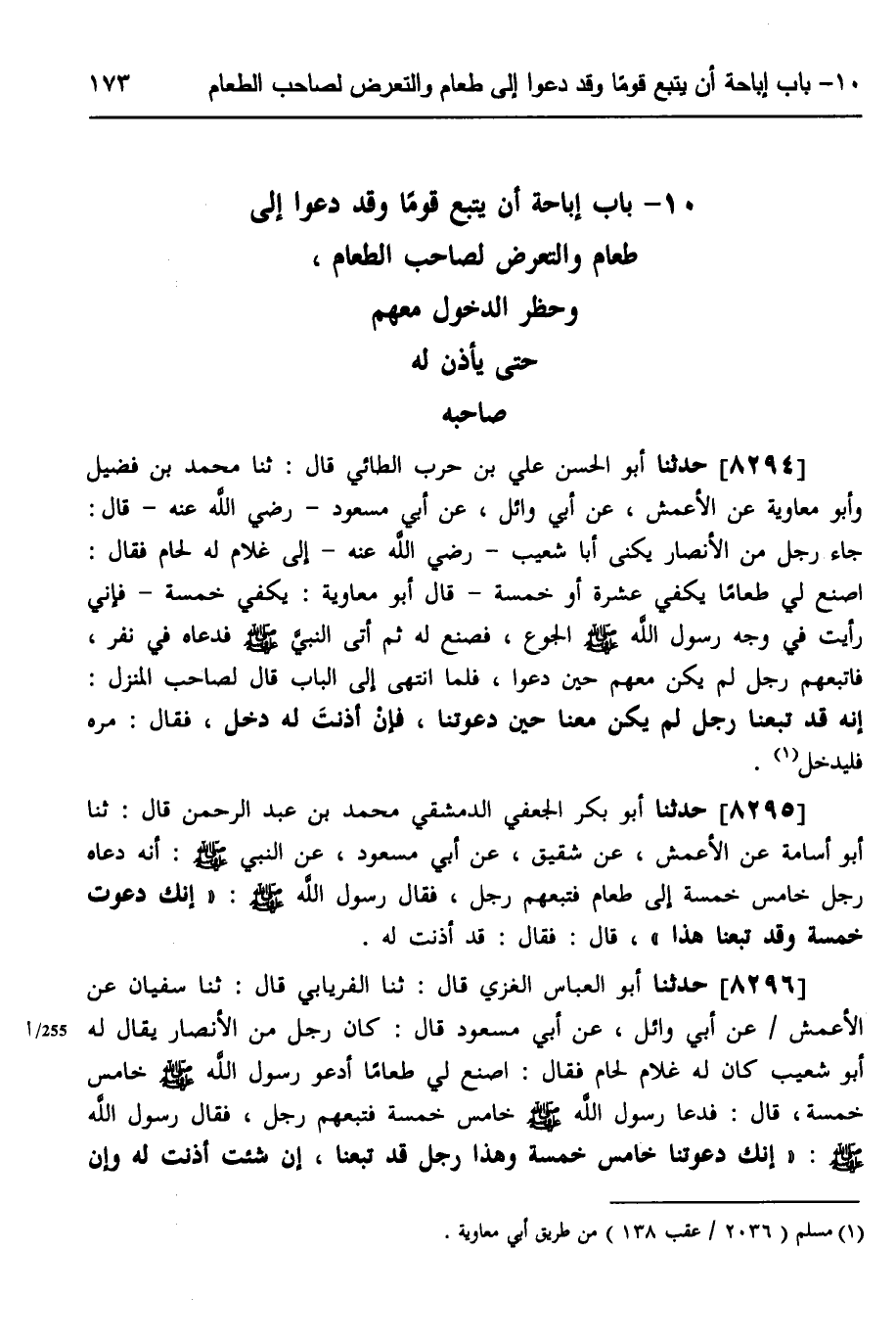 8294 - حَدَّثَنَا أَبُو الْحَسَنِ عَلِيُّ بْنُ حَرْبٍ الطَّائِيُّ، قَالَ: ثَنَا مُحَمَّدُ بْنُ فُضَيْلٍ، وَأَبُو مُعَاوِيَةَ، عَنِ الْأَعْمَشِ، عَنْ أَبِي وَائِلٍ، عَنْ أَبِي مَسْعُودٍ رَضِيَ اللَّهُ عَنْهُ، قَالَ: جَاءَ رَجُلٌ مِنَ الْأَنْصَارِ يُكْنَى أَبَا شُعَيْبٍ رَضِيَ اللَّهُ عَنْهُ، إِلَى غُلَامٍ لَهُ لَحَّامٍ، فَقَالَ: اصْنَعْ لِي طَعَامًا يَكْفِي عَشْرَةً، أَوْ خَمْسَةً، قَالَ: أَبُو مُعَاوِيَةَ يَكْفِي خَمْسَةً، فَإِنِّي رَأَيْتُ فِي وَجْهِ رَسُولِ اللَّهِ صَلَّى اللهُ عَلَيْهِ وَسَلَّمَ الْجُوعَ، فَصَنَعَ لَهُ، ثُمَّ أَتَى النَّبِيَّ صَلَّى اللهُ عَلَيْهِ وَسَلَّمَ، فَدَعَاهُ فِي نَفَرٍ، فَاتَّبَعَهُمْ رَجُلٌ لَمْ يَكُنْ مَعَهُمْ، حِينَ دُعُوا، فَلَمَّا انْتَهَى إِلَى الْبَابِ، قَالَ لِصَاحِبِ الْمَنْزِلِ: «§إِنَّهُ قَدْ تَبِعَنَا رَجُلٌ لَمْ يَكُنْ مَعَنَا، حِينَ دَعَوْتَنَا، فَإِنْ أَذِنْتَ لَهُ دَخَلَ» ، فَقَالَ: مُرْهُ فَلْيَدْخُلْ