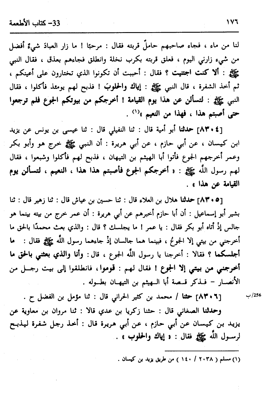 8304 - حَدَّثَنَا أَبُو أُمَيَّةَ، قَالَ: ثَنَا النُّفَيْلِيُّ، قَالَ: ثَنَا عِيسَى بْنُ يُونُسَ، عَنْ يَزِيدَ بْنِ كَيْسَانَ، عَنْ أَبِي حَازِمٍ، عَنْ أَبِي هُرَيْرَةَ، أَنَّ النَّبِيَّ صَلَّى اللهُ عَلَيْهِ وَسَلَّمَ خَرَجَ، هُوَ، وَأَبُو بَكْرٍ، وَعُمَرُ، أَخْرَجَهُمُ الْجُوعُ، فَأَتَوْا أَبَا الْهَيْثَمِ بْنَ التَّيْهَانِ، فَذَبَحَ لَهُمْ، فَأَكَلُوا، وَشَبِعُوا، فَقَالَ: لَهُمْ رَسُولُ اللَّهِ صَلَّى اللهُ عَلَيْهِ وَسَلَّمَ: «§أَخْرَجَكُمُ الْجُوعُ، فَأَصَبْتُمْ هَذَا، هَذَا النَّعِيمَ لَتُسْأَلُنَّ يَوْمَ الْقِيَامَةِ، عَنْ هَذَا»