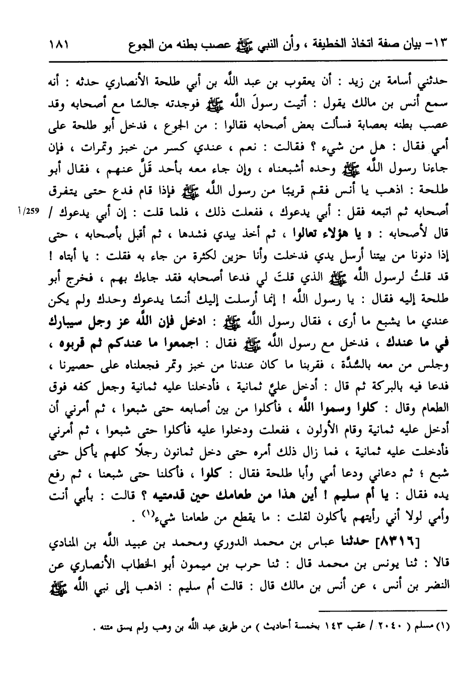 8316 - حَدَّثَنَا عَبَّاسُ بْنُ مُحَمَّدٍ الدُّورِيُّ، وَمُحَمَّدُ بْنُ عُبَيْدِ اللَّهِ بْنِ الْمُنَادِي، قَالَا: ثَنَا يُونُسُ بْنُ مُحَمَّدٍ، قَالَ: ثَنَا حَرْبُ بْنُ مَيْمُونٍ أَبُو الْخَطَّابِ الْأَنْصَارِيُّ، عَنِ النَّضْرِ بْنِ أَنَسٍ، عَنْ أَنَسِ بْنِ مَالِكٍ، قَالَ: قَالَتْ أُمُّ سُلَيْمٍ: §اذْهَبْ إِلَى نَبِيِّ اللَّهِ صَلَّى اللهُ عَلَيْهِ وَسَلَّمَ -[182]-، فَقُلْ لَهُ: إِنْ رَأَيْتَ أَنْ تَتَغَدَّي عِنْدَنَا، فَافْعَلْ، قَالَ: فَجِئْتُهُ فَبَلَّغْتُهُ، فَقَالَ: «وَمَنْ عِنْدِي؟» ، فَقُلْتُ نَعَمْ، فَقَالَ: انْهَضُوا، قَالَ: فَجِئْتُ، فَدَخَلْتُ عَلَى أُمِّ سُلَيْمٍ، وَأَنَا مَدْهَشٌ، بِمَنْ أَقْبَلَ مَعَ النَّبِيِّ صَلَّى اللهُ عَلَيْهِ وَسَلَّمَ، فَقَالَتْ أُمُّ سُلَيْمٍ: مَا صَنَعْتَ يَا أَنَسُ؟، فَدَخَلَ رَسُولُ اللَّهِ صَلَّى اللهُ عَلَيْهِ وَسَلَّمَ عَلَى أَثَرِ ذَلِكَ، فَذَكَرْتُ لَهُ أَنَّهُ أَرْسَلَنِي إِلَيْكَ، وَهَذَا غَدَاؤُكَ، قَالَ: «هَلْ عِنْدَكِ سَمْنٌ؟» ، قَالَتْ: نَعَمْ، قَدْ كَانَ عِنْدِي مِنْهُ، عُكَّةٌ فِيهَا سَمْنٌ، قَالَ: «فَأْتِنِي بِهَا» ، قَالَ: فَجِئْتُهُ بِهَا، فَفَتَحَ رِبَاطِهَا، فَقَالَ: «بِسْمِ اللَّهِ اللَّهُمَّ أَعْظَمْ فِيهَا الْبَرَكَةَ» ، فَقَالَ: اقْلِبْهَا، فَعَصَرَهَا نَبِيُّ اللَّهِ صَلَّى اللهُ عَلَيْهِ وَسَلَّمَ، وَهُوَ يُسَمِّي، فَأَخَذَتْ تَقَعُ فِدَرًا، فَأَكَلَ مِنْهُ بِضْعٌ، وَثَمَانُونَ رَجُلًا، وَفَضَلَ مِنْهَا فَضْلٌ، فَدَفَعَهُ إِلَيَّ أُمِّ سُلَيْمٍ، فَقَالَ: «كُلِي، وَأَطْعِمِي جِيرَانَكٍ»