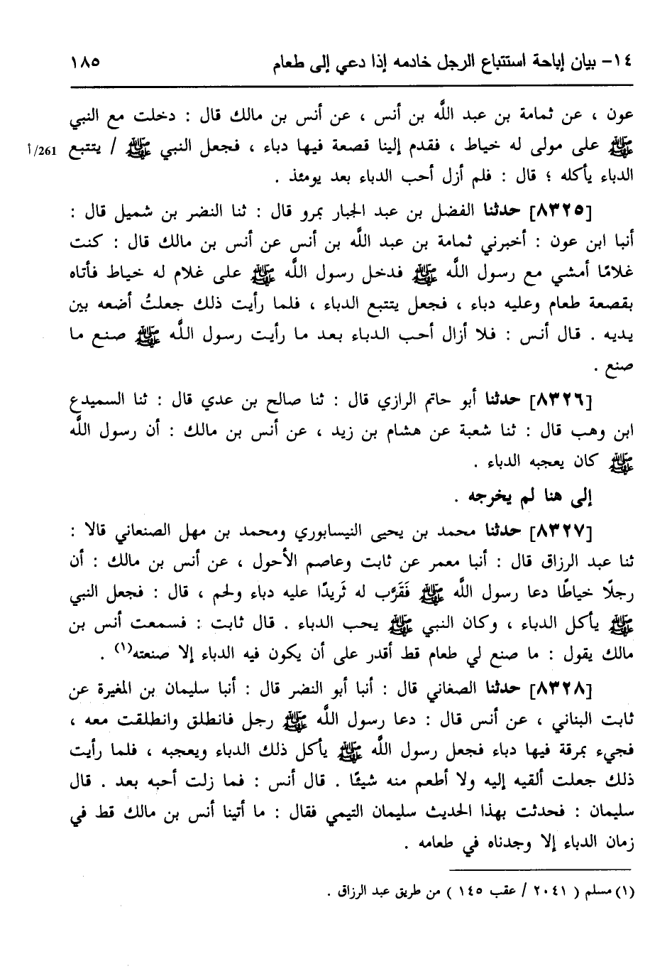 8325 - حَدَّثَنَا الْفَضْلُ بْنُ عَبْدِ الْجَبَّارِ، بِمَرْوَ، قَالَ: ثَنَا النَّضْرُ بْنُ شُمَيْلٍ، قَالَ: أَنْبَأَ ابْنُ عَوْنٍ، أَخْبَرَنِي ثُمَامَةُ بْنُ عَبْدِ اللَّهِ بْنِ أَنَسٍ، عَنْ أَنَسِ بْنِ مَالِكٍ، قَالَ: «كُنْتُ غُلَامًا أَمْشِي مَعَ رَسُولِ اللَّهِ صَلَّى اللهُ عَلَيْهِ وَسَلَّمَ، §فَدَخَلَ رَسُولُ اللَّهِ صَلَّى اللهُ عَلَيْهِ وَسَلَّمَ، عَلَى غُلَامٍ لَهُ خَيَّاطٍ، فَأَتَاهُ بِقَصْعَةٍ طَعَامٍ، وَعَلَيْهِ دُبَّاءٌ، فَجَعَلَ يَتَتَبَّعُ الدُّبَّاءَ، فَلَمَّا رَأَيْتُ ذَلِكَ، جَعَلْتُ أَضَعُهُ بَيْنَ يَدَيْهِ،» ، قَالَ أَنَسٌ: «فَلَا أَزَالُ أَحَبُّ الدُّبَّاءَ بَعْدَ مَا رَأَيْتُ رَسُولَ اللَّهِ صَلَّى اللهُ عَلَيْهِ وَسَلَّمَ صَنَعَ مَا صَنَعَ»