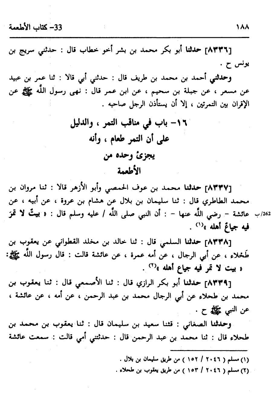 8336 - حَدَّثَنَا أَبُو بَكْرٍ مُحَمَّدُ بْنُ بِشْرٍ أَخُو خَطَّابٍ قَالَ: حَدَّثَنِي سُرَيْجُ بْنُ يُونُسَ، ح، وَحَدَّثَنِي أَحْمَدُ بْنُ مُحَمَّدِ بْنِ طَرِيفٍ، قَالَ: حَدَّثَنِي أَبِي، قَالَا: ثَنَا عُمَرُ بْنُ عُبَيْدٍ، عَنْ مِسْعَرٍ، عَنْ جَبَلَةَ بْنِ سُحَيْمٍ، عَنِ ابْنِ عُمَرَ، قَالَ: «§نَهَى رَسُولُ اللَّهِ صَلَّى اللهُ عَلَيْهِ وَسَلَّمَ، عَنِ الْإِقْرَانِ بَيْنَ التَّمْرَتَيْنِ، إِلَّا أَنْ يَسْتَأْذِنَ الرَّجُلَ صَاحِبَهُ»