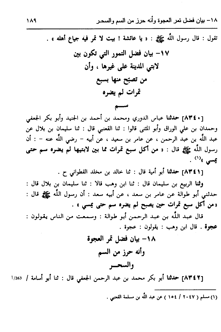 8342 - حَدَّثَنَا أَبُو بَكْرٍ مُحَمَّدُ بْنُ عَبْدِ الرَّحْمَنِ الْجُعْفِيُّ، قَالَ: ثَنَا أَبُو أُسَامَةُ -[190]-، قَالَ ثَنَا هَاشِمُ بْنُ هَاشِمِ بْنِ عُتْبَةَ بْنِ أَبِي وَقَّاصٍ، عَنْ عَامِرِ بْنِ سَعْدِ بْنِ أَبِي وَقَّاصٍ، عَنْ سَعْدِ بْنِ أَبِي وَقَّاصٍ، قَالَ: سَمِعْتُ رَسُولَ اللَّهِ صَلَّى اللهُ عَلَيْهِ وَسَلَّمَ، يَقُولُ: «§مَنْ تَصَبَّحَ سَبْعَ تَمَرَاتٍ مِنْ عَجْوَةٍ، لَمْ يَضُرَّهُ ذَلِكَ الْيَوْمَ سُمٌّ، وَلَا سِحْرٌ»