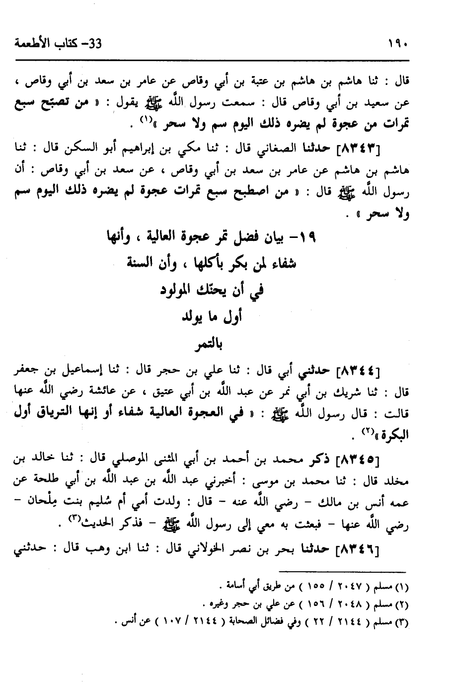 8343 - حَدَّثَنَا الصَّغَانِيُّ، قَالَ: ثَنَا مَكِّيُّ بْنُ إِبْرَاهِيمَ أَبُو السَّكَنِ، قَالَ: ثَنَا هَاشِمُ بْنُ هَاشِمٍ، عَنْ عَامِرِ بْنِ سَعْدِ بْنِ أَبِي وَقَّاصٍ، عَنْ سَعْدِ بْنِ أَبِي وَقَّاصٍ، أَنَّ رَسُولَ اللَّهِ صَلَّى اللهُ عَلَيْهِ وَسَلَّمَ قَالَ: «§مِنَ اصْطَبَحَ سَبْعَ تَمَرَاتٍ عَجْوَةً، لَمْ يَضُرَّهُ ذَلِكَ الْيَوْمَ سُمٌّ، وَلَا سِحْرٌ»
