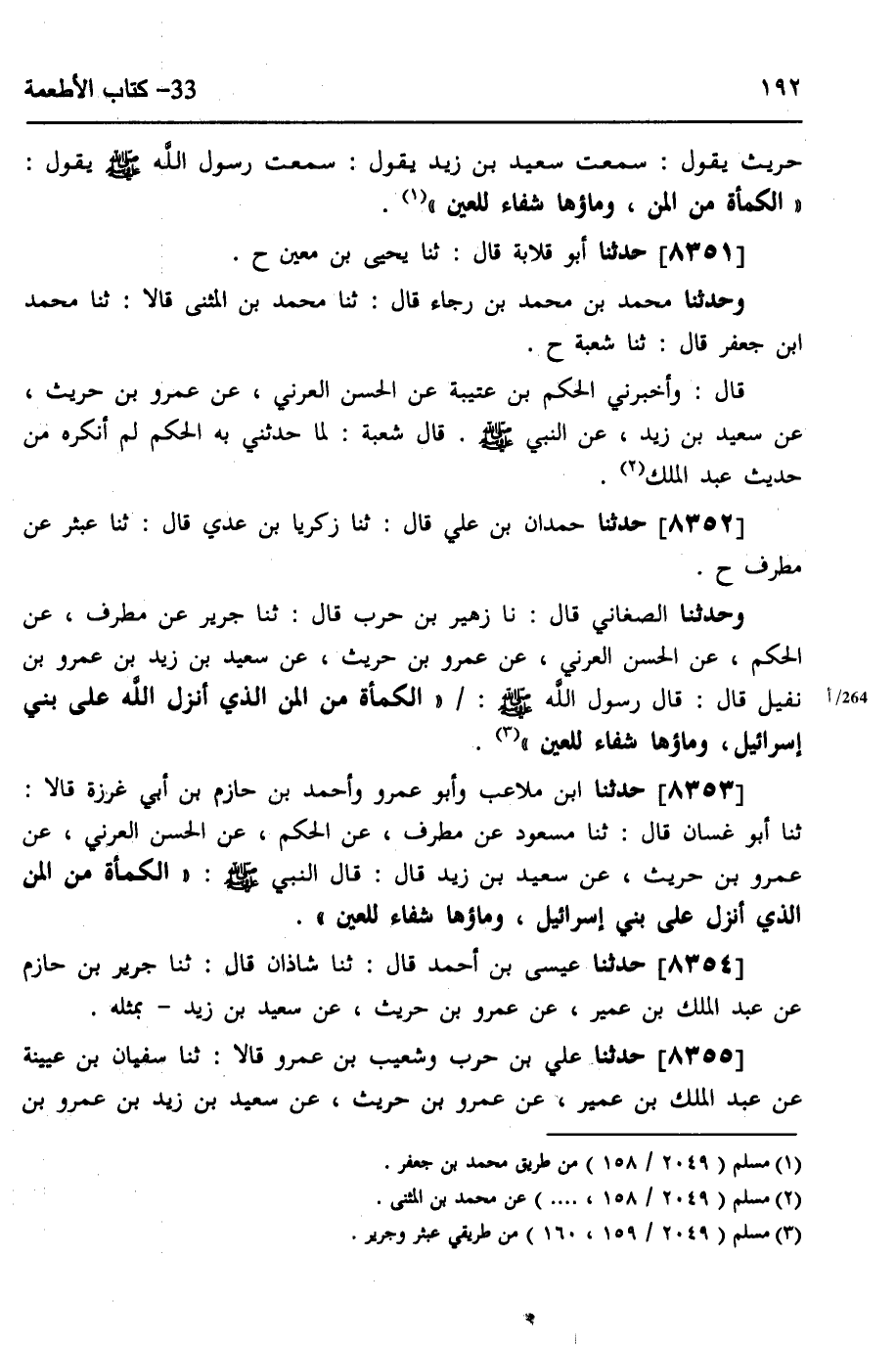 8352 - حَدَّثَنَا حَمْدَانُ بْنُ عَلِيٍّ، قَالَ: ثَنَا زَكَرِيَّا بْنُ عَدِيٍّ، قَالَ: ثَنَا عَبْثَرٌ، عَنْ مُطَرِّفٍ، ح، وَحَدَّثَنَا الصَّغَانِيُّ، قَالَ: نَا زُهَيْرُ بْنُ حَرْبٍ، قَالَ: ثَنَا جَرِيرٌ، عَنْ مُطَرِّفٍ، عَنِ الْحَكَمِ، عَنِ الْحَسَنِ الْعُرَنِيِّ، عَنْ عَمْرِو بْنِ حُرَيْثٍ، عَنْ سَعِيدِ بْنِ زَيْدِ بْنِ عَمْرِو بْنِ نُفَيْلٍ، قَالَ: قَالَ رَسُولُ اللَّهِ صَلَّى اللهُ عَلَيْهِ وَسَلَّمَ: «§الْكَمْأَةُ مِنَ الْمَنِّ، الَّذِي أَنْزَلَ اللَّهُ عَلَى بَنِي إِسْرَائِيلَ، وَمَاؤُهَا شِفَاءٌ لِلْعَيْنِ»