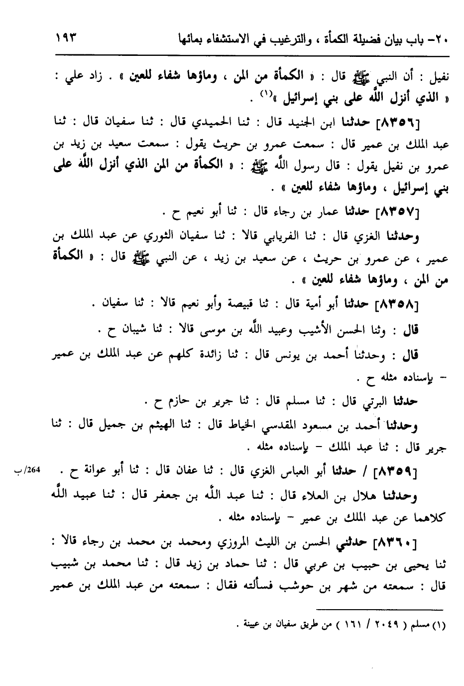 8360 - حَدَّثَنِي الْحَسَنُ بْنُ اللَّيْثِ الْمَرْوَزِيُّ، وَمُحَمَّدُ بْنُ مُحَمَّدِ بْنِ رَجَاءٍ، قَالَا ثَنَا يَحْيَى بْنُ حَبِيبِ بْنِ عَرَبِيٍّ، قَالَ: ثَنَا حَمَّادُ بْنُ زَيْدٍ، قَالَ: ثَنَا مُحَمَّدُ بْنُ شَبِيبٍ، قَالَ: سَمِعْتُهُ مِنْ شَهْرِ بْنِ حَوْشَبٍ، فَسَأَلْتُهُ، فَقَالَ: سَمِعْتُهُ مِنْ عَبْدِ الْمَلِكِ بْنِ عُمَيْرٍ -[194]-، قَالَ: فَلَقِيتُ عَبْدَ الْمَلِكِ فَحَدَّثَنِي، عَنْ عَمْرِو بْنِ حُرَيْثٍ، عَنْ سَعِيدِ بْنِ زَيْدٍ، قَالَ: قَالَ رَسُولُ اللَّهِ صَلَّى اللهُ عَلَيْهِ وَسَلَّمَ: «§الْكَمْأَةُ مِنَ الْمَنِّ، وَمَاؤُهَا شِفَاءٌ لِلْعَيْنِ»
