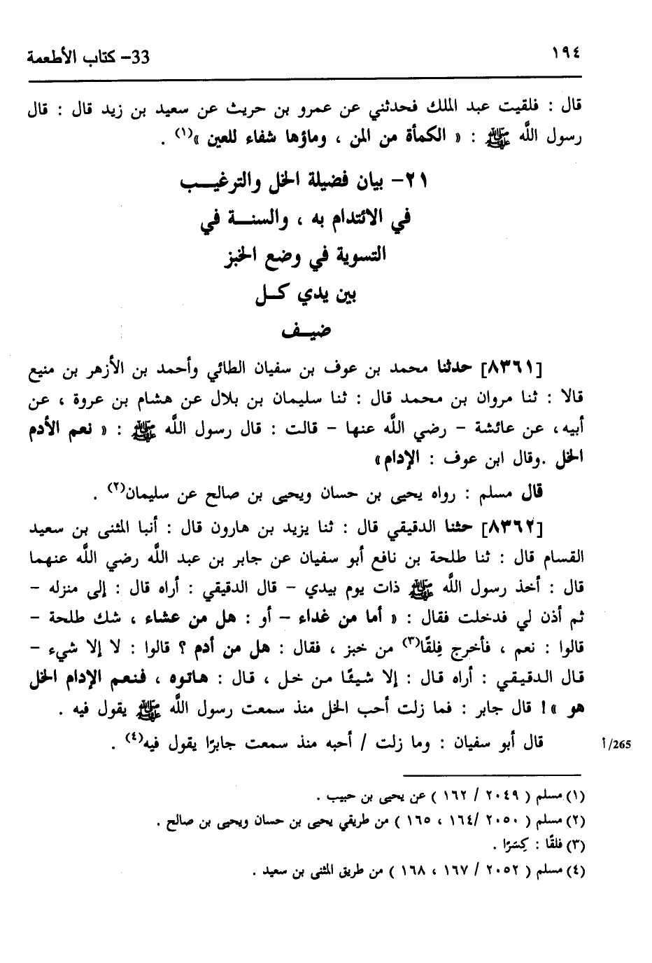 §بَيَانُ فَضِيلَةِ الْخَلِّ، وَالتَّرْغِيبِ فِي الِائْتِدَامِ بِهِ، وَالسُّنَّةُ فِي التَّسْوِيَةِ فِي وَضَعِ الْخُبْزِ بَيْنَ يَدَيْ كُلِّ ضَيْفٍ