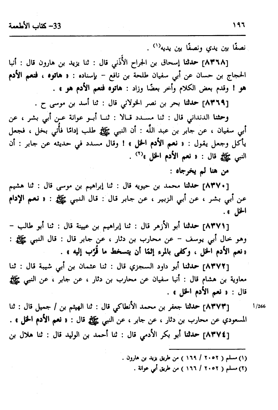 8369 - حَدَّثَنَا بَحْرُ بْنُ نَصْرٍ الْخَوْلَانِيُّ، قَالَ: ثَنَا أَسَدُ بْنُ مُوسَى، ح، وحثنا الدَّنْدَانِيُّ، قَالَ: ثَنَا مُسَدَّدٌ، قَالَا: ثَنَا أَبُو عَوَانَةَ، عَنْ أَبِي بِشْرٍ، عَنْ أَبِي سُفْيَانَ، عَنْ جَابِرِ بْنِ عَبْدِ اللَّهِ، أَنَّ النَّبِيَّ صَلَّى اللهُ عَلَيْهِ وَسَلَّمَ، طَلَبَ إِدَامًا، فَأُتِيَ بَخَلٍّ، فَجَعَلَ يَأْكُلُ، وَجَعَلَ يَقُولُ: «نِعْمَ الْأُدُمُ الْخَلُّ» ، وَقَالَ مُسَدَّدٌ فِي حَدِيثِهِ، عَنْ جَابِرٍ أَنَّ النَّبِيَّ صَلَّى اللهُ عَلَيْهِ وَسَلَّمَ، قَالَ: «§نِعْمَ الْأُدُمُ الْخَلُّ» ، مِنْ هُنَا لَمْ يُخْرِجَاهُ