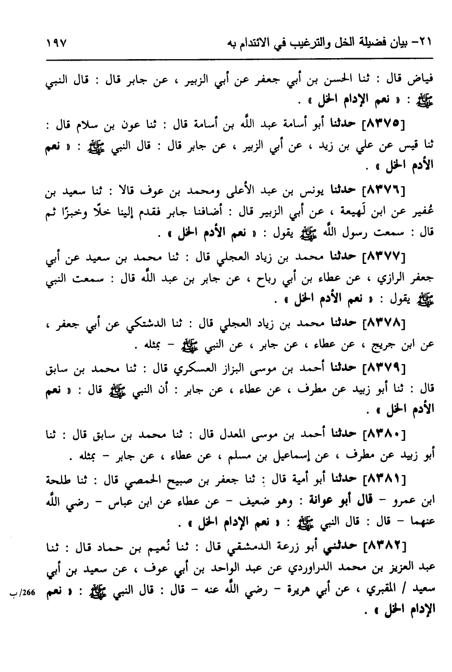 8376 - حَدَّثَنَا يُونُسُ بْنُ عَبْدِ الْأَعْلَى، وَمُحَمَّدُ بْنُ عَوْفٍ، قَالَا ثَنَا سَعِيدُ بْنُ عُفَيْرٍ، عَنِ ابْنِ لَهِيعَةَ، عَنْ أَبِي الزُّبَيْرِ، قَالَ: أَضَافَنَا جَابِرٌ، فَقَدِمَ إِلَيْنَا خَلَا، وَخُبْزًا، ثُمَّ قَالَ: سَمِعْتُ رَسُولَ اللَّهِ صَلَّى اللهُ عَلَيْهِ وَسَلَّمَ، يَقُولُ: «§نِعْمَ الْأُدُمُ الْخَلُّ»