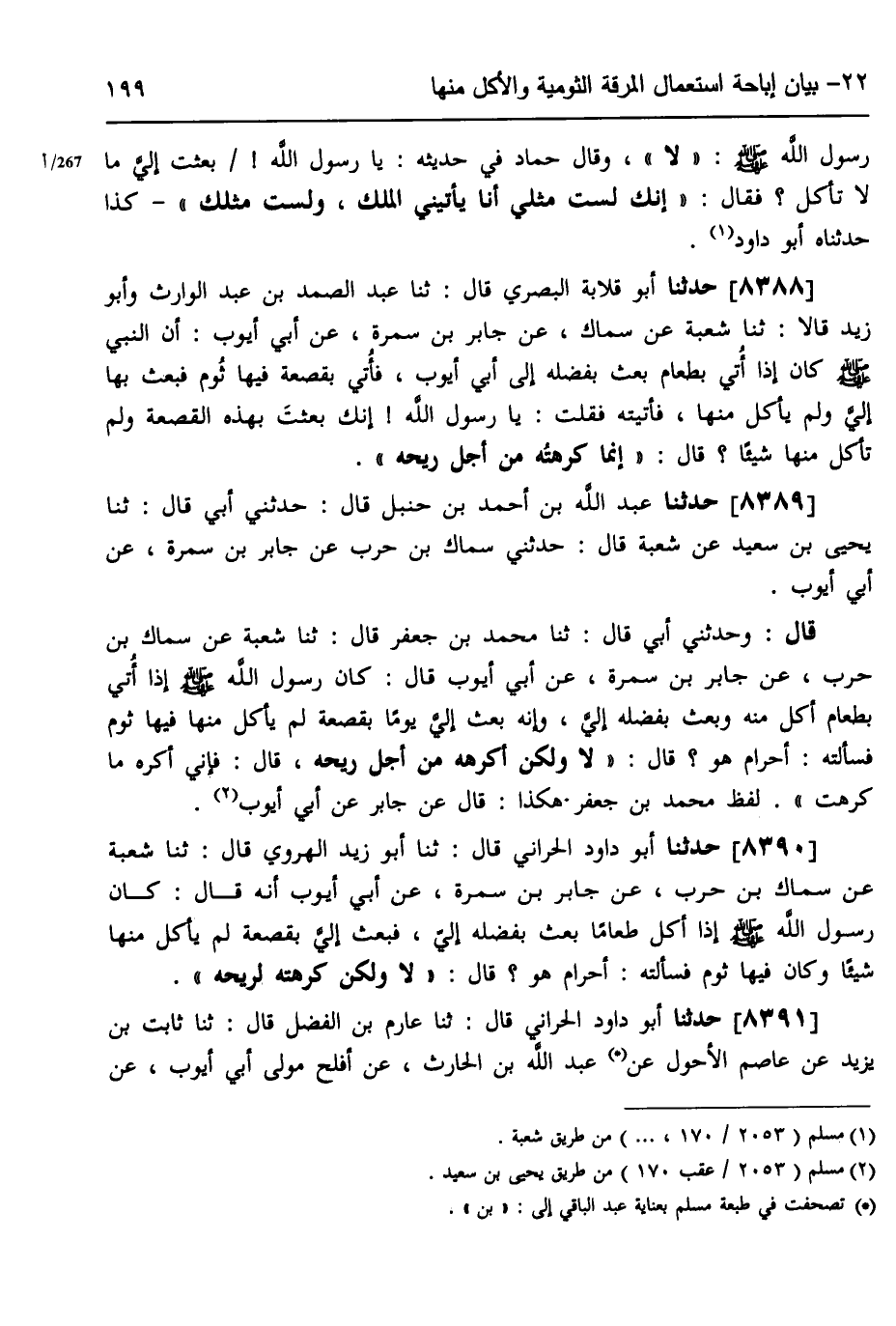 8390 - حَدَّثَنَا أَبُو دَاوُدَ الْحَرَّانِيُّ، قَالَ: ثَنَا أَبُو زَيْدٍ الْهَرَوِيُّ، قَالَ: ثَنَا شُعْبَةُ، عَنْ سِمَاكِ بْنِ حَرْبٍ، عَنْ جَابِرِ بْنِ سَمُرَةَ، عَنْ أَبِي أَيُّوبَ، أَنَّهُ قَالَ: كَانَ §رَسُولُ اللَّهِ صَلَّى اللهُ عَلَيْهِ وَسَلَّمَ، إِذَا أَكَلَ طَعَامًا، بَعَثَ بِفَضْلِهِ إِلَيَّ، فَبَعَثَ إِلَيَّ بِقَصْعَةٍ، لَمْ يَأْكُلْ مِنْهَا شَيْئًا، وَكَانَ فِيهَا ثُومٌ، فَسَأَلْتُهُ: أَحَرَامٌ هُوَ؟، قَالَ: «لَا، وَلَكِنْ كَرِهْتَهُ لِرِيحِهِ»