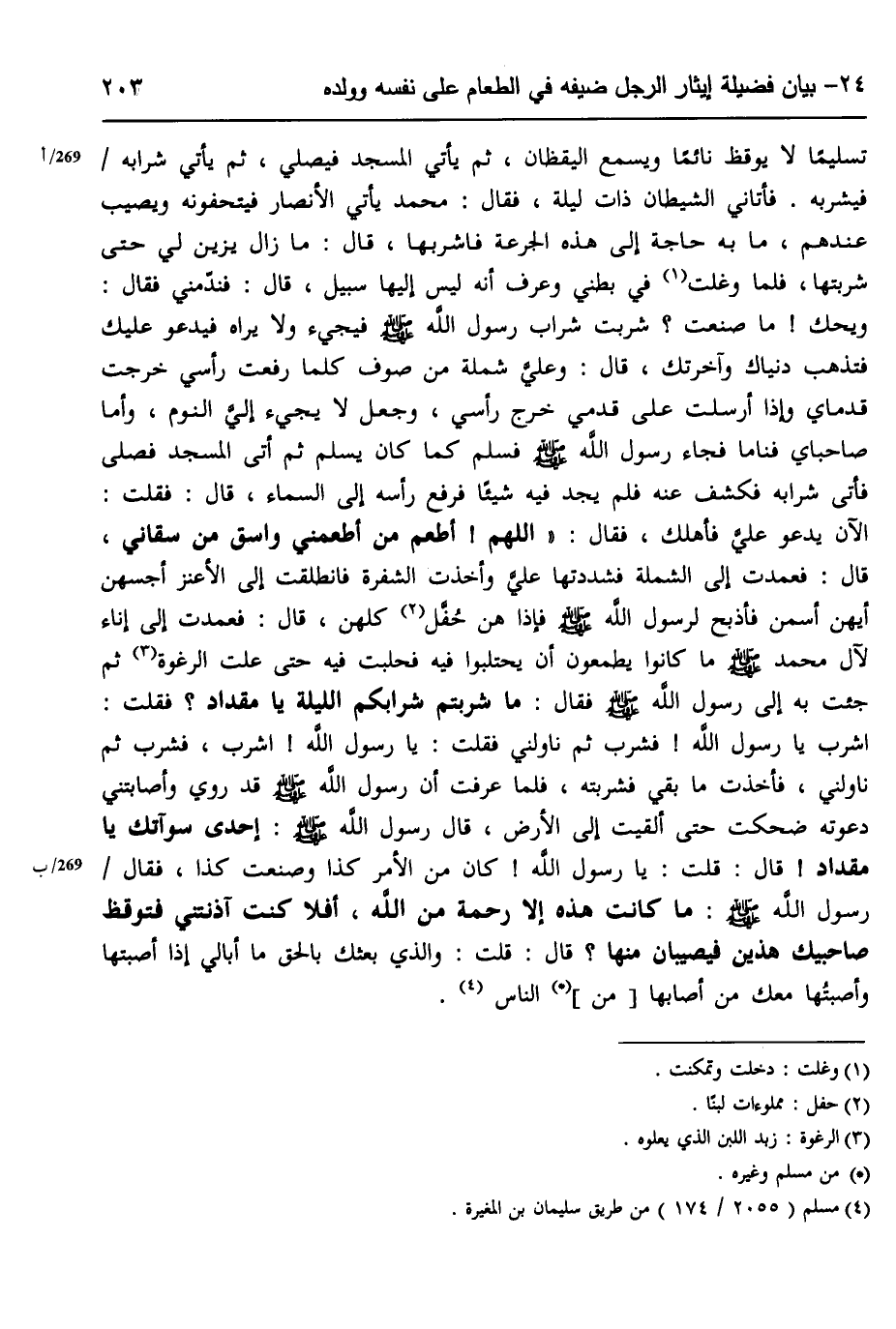 ثُمَّ يَأْتِي الْمَسْجِدَ ، فَيُصَلِّي ، ثُمَّ يَأْتِي شَرَابَهُ ، فَيَشْرَبُهُ ، فَأَتَانِي الشَّيْطَانُ ذَاتَ لَيْلَةٍ ، فَقَالَ : مُحَمَّدٌ يَأْتِي الأَنْصَارَ ، فَيُتْحِفُونَهُ ، وَيُصِيبُ عِنْدَهُمْ مَا بِهِ حَاجَةٌ إِلَى هَذِهِ الْجَرْعَةِ ، فَاشْرَبْهَا ، قَالَ : مَا زَالَ يُزَيِّنُ لِي حَتَّى شَرِبْتُهَا ، فَلَمَّا وَغَلَتْ فِي بَطْنِي ، وَعَرَفَ أَنَّهُ لَيْسَ إِلَيْهَا سَبِيلٌ ، قَالَ : فَنَدَّمَنِي ، فَقَالَ : وَيْحَكَ ، مَا صَنَعْتَ ؟ شَرِبْتَ شَرَابَ رَسُولِ اللهِ صَلَّى الله عَلَيهِ وسَلَّم ، فَيَجِيءُ وَلا يَرَاهُ ، فَيَدْعُو عَلَيْكَ ، فَتَذْهَبُ دُنْيَاكَ وَآخِرَتُكَ ، قَالَ : وَعَلَيَّ شَمْلَةٌ مِنْ صُوفٍ ، كُلَّمَا رَفَعَتُ رَأْسِي خَرَجَتْ قَدَمَايَ ، وَإِذَا أَرْسَلْتُ عَلَى قَدَمَيَّ خَرَجَ رَأْسِي ، وَجَعَلَ لا يَجِيءُ إِلَيَّ النَّوْمُ ، وَأَمَّا صَاحِبَايَ فَنَامَا ، فَجَاءَ رَسُولُ اللهِ صَلَّى الله عَلَيهِ وسَلَّم ، فَسَلَّمَ كَمَا كَانَ يُسَلِّمُ ، ثُمَّ أَتَى الْمَسْجِدَ ، فَصَلَّى ، فَأَتَى شَرَابَهُ ، فَكَشَفَ عَنْهُ ، فَلَمْ يَجِدْ فِيهِ شَيْئًا ، فَرَفَعَ رَأْسَهُ إِلَى السَّمَاءِ ، قَالَ : فَقُلْتُ : الآنَ يَدْعُو عَلَيَّ ، فَأَهْلِكَ ، فَقَالَ : اللَّهُمَّ ، أَطْعِمْ مِنْ أَطْعَمَنِي ، وَاسْقِ مَنْ سَقَانِي ، قَالَ : فَعَمَدْتُ إِلَى الشَّمْلَةِ ، فَشَدَدْتُهَا عَلَيَّ ، وَأَخَذْتُ الشَّفْرَةَ ، فَانْطَلَقْتُ إِلَى الأَعْنُزِ أَجُسُّهُنَّ أَيُّهُنَّ أَسْمَنُ ، فَأَذْبَحُ لِرَسُولِ اللهِ صَلَّى الله عَلَيهِ وسَلَّم ، فَإِذَا هُنَّ حُفَّلٌ كُلُّهُنَّ ، قَالَ : فَعَمَدْتُ إِلَى إِنَاءٍ لآلِ مُحَمَّدٍ صَلَّى الله عَلَيهِ وسَلَّم ، مَا كَانُوا يَطْمَعُونَ أَنْ يَحْتَلِبُوا فِيهِ ، فَحَلَبْتُ فِيهِ حَتَّى عَلَتِ الرَّغْوَةُ ، ثُمَّ جِئْتُ بِهِ إِلَى رَسُولِ اللهِ صَلَّى الله عَلَيهِ وسَلَّم ، فَقَالَ : مَا شَرِبْتُمْ شَرَابَكُمُ اللَّيْلَةَ يَا مِقْدَادُ ؟ فَقُلْتُ : اشْرَبْ يَا رَسُولَ اللهِ ، فَشَرِبَ ، ثُمَّ نَاوَلَنِي ، فَقُلْتُ : يَا رَسُولَ اللهِ ، اشْرَبْ ، فَشَرِبَ ، ثُمَّ نَاوَلَنِي ، فَأَخَذْتُ مَا بَقِيَ ، فَشَرِبْتُهُ ، فَلَمَّا عَرَفْتُ أَنَّ رَسُولَ اللهِ صَلَّى الله عَلَيهِ وسَلَّم قَدْ رَوِيَ وَأَصَابَتْنِي دَعْوَتُهُ ، ضَحِكْتُ حَتَّى أُلْقِيَتُ إِلَى الأَرْضِ ، قَالَ رَسُولُ اللهِ صَلَّى الله عَلَيهِ وسَلَّم : إِحْدَى سَوْآتِكَ يَا مِقْدَادُ ، قَالَ : قُلْتُ يَا رَسُولَ اللهِ ، كَانَ مِنَ الأَمْرِ كَذَا ، وَصَنَعتُ كَذَا ، فَقَالَ رَسُولُ اللهِ صَلَّى الله عَلَيهِ وسَلَّم : مَا كَانَتْ هَذِهِ إِلا رَحْمَةً مِنَ اللهِ ، أَفَلا كُنْتَ آذَنْتَنِي ، فَتُوقِظَ صَاحِبَيْكَ هَذَيْنِ فَيُصِيبَانِ مِنْهَا ؟ قَالَ : قُلْتُ : وَالَّذِي بَعَثَكَ بِالْحَقِّ مَا أُبَالِي إِذَا أَصَبْتَهَا ، وَأَصَبْتُهَا مَعَكَ مَنْ أَصَابَهَا مِنَ النَّاسِ.
