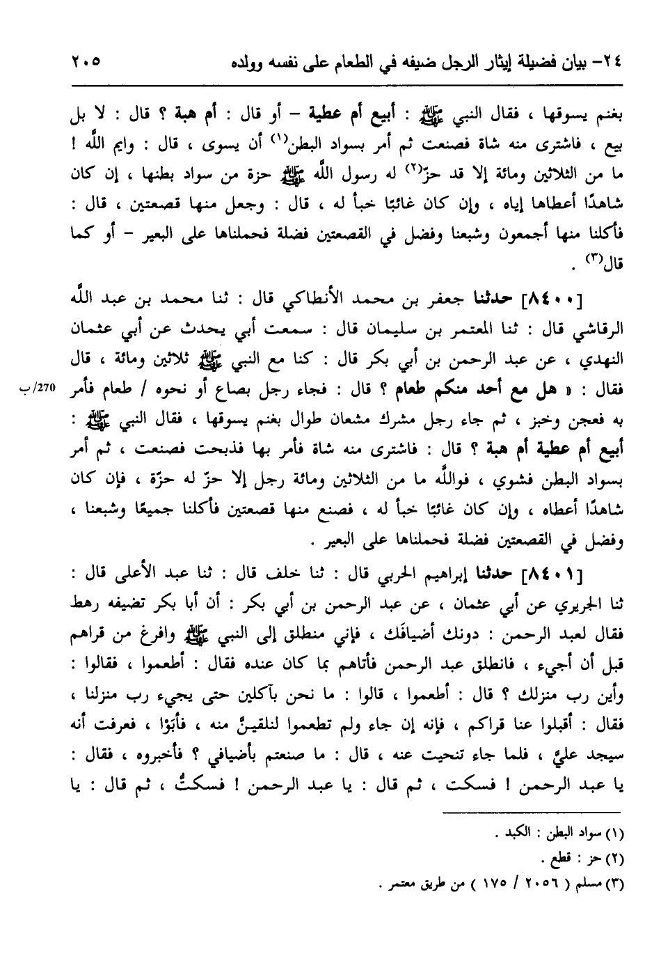 8400 - حَدَّثَنَا جَعْفَرُ بْنُ مُحَمَّدٍ الْأَنْطَاكِيُّ، قَالَ: ثَنَا مُحَمَّدُ بْنُ عَبْدِ اللَّهِ الرَّقَاشِيُّ، قَالَ: ثَنَا الْمُعْتَمِرُ بْنُ سُلَيْمَانَ، قَالَ: سَمِعْتُ أَبِي يُحَدِّثُ عَنْ أَبِي عُثْمَانَ النَّهْدِيِّ، عَنْ عَبْدِ الرَّحْمَنِ بْنِ أَبِي بَكْرٍ، قَالَ: كُنَّا مَعَ النَّبِيِّ صَلَّى اللهُ عَلَيْهِ وَسَلَّمَ ثَلَاثِينَ وَمِائَةٌ، قَالَ: فَقَالَ: «§هَلْ مَعَ أَحَدٍ مِنْكُمْ طَعَامٌ؟» ، قَالَ: فَجَاءَ رَجُلٌ بِصَاعٍ، أَوْ نَحْوِهِ طَعَامٍ، فَأَمَرَ بِهِ فَعُجِنَ، وَخُبْزَ، ثُمَّ جَاءَ رَجُلٌ مُشْرِكٌ مُشْعَانٌّ طُوَالٌ، بِغَنَمٍ يَسُوقُهَا، فَقَالَ النَّبِيُّ صَلَّى اللهُ عَلَيْهِ وَسَلَّمَ: «أَبِيعٌ، أَمْ عَطِيَّةٌ، أَمْ هِبَةٌ؟» ، قَالَ: فَاشْتَرَى مِنْهُ شَاةً، فَأَمَرَ بِهَا فَذَبَحْتُ، فَصَنَعْتُ، ثُمَّ أَمَرَ بِسَوَادِ الْبَطْنِ، فَشُوِيَ، فَوَاللَّهِ مَا مِنَ الثَّلَاثِينَ، وَمِائَةِ رَجُلٍ إِلَّا حَزَّ لَهُ حُزَّةً، فَإِنْ كَانَ شَاهِدًا أَعْطَاهُ، وَإِنْ كَانَ غَائِبًا خَبَأَ لَهُ، فَصَنَعَ مِنْهَا قَصْعَتَيْنِ، فَأَكَلْنَا جَمِيعًا، وَشَبِعْنَا، وَفَضَلَ فِي الْقَصْعَتَيْنِ فَضْلَةٌ، فَحَمَلْنَاهَا عَلَى الْبَعِيرِ