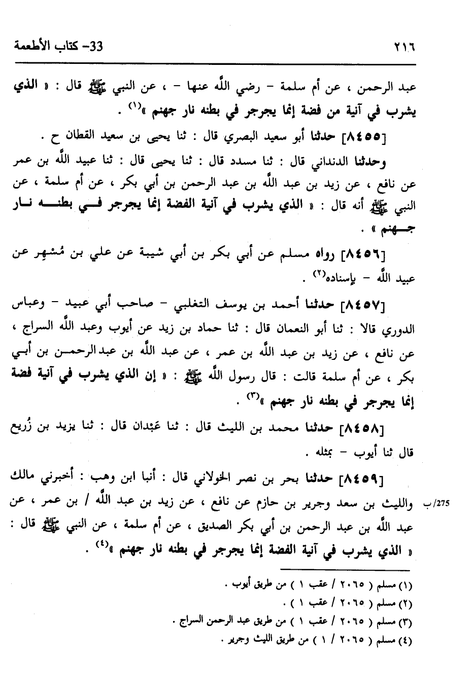 8459 - حَدَّثَنَا بَحْرُ بْنُ نَصْرٍ الْخَوْلَانِيُّ، قَالَ: أَنْبَأَ ابْنُ وَهْبٍ، أَخْبَرَنِي مَالِكٌ، وَاللَّيْثُ بْنُ سَعْدٍ، وَجَرِيرُ بْنُ حَازِمٍ، عَنْ نَافِعٍ، عَنْ زَيْدِ بْنِ عَبْدِ اللَّهِ بْنِ عُمَرَ، عَنْ عَبْدِ اللَّهِ بْنِ عَبْدِ الرَّحْمَنِ بْنِ أَبِي بَكْرٍ الصِّدِّيقِ، عَنْ أُمِّ سَلَمَةَ، عَنِ النَّبِيِّ صَلَّى اللهُ عَلَيْهِ وَسَلَّمَ، قَالَ: «§الَّذِي يَشْرَبُ فِي آنِيَةِ الْفِضَّةِ، إِنَّمَا يُجَرْجِرُ فِي بَطْنِهِ نَارَ جَهَنَّمَ» -[217]-،