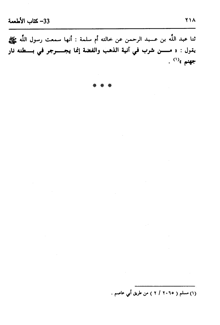 8467- حَدَّثَنَا يَزِيدُ بْنُ سِنَانٍ ، قَالَ : حَدَّثَنَا أَبُو عَاصِمٍ ، عَنْ عُثْمَانَ بْنِ مُرَّةَ ، قَالَ : حَدَّثَنَا عَبْدُ اللهِ بْنُ عَبْدِ الرَّحْمَنِ ، عَنْ خَالَتِهِ أُمِّ سَلَمَةَ ، أَنَّهَا سَمِعَتْ رَسُولَ اللهِ صَلَّى الله عَلَيهِ وسَلَّم يَقُولُ : مَنْ شَرِبَ فِي آنِيَةِ الذَّهَبِ وَالْفِضَّةِ ، إِنَّمَا يُجَرْجِرُ فِي بَطْنِهِ نَارَ جَهَنَّمَ.