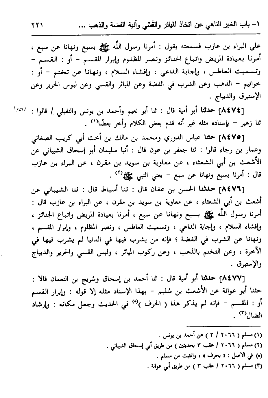 8476 - حَدَّثَنَا الْحَسَنُ بْنُ عَفَّانَ، قَالَ: ثَنَا أَسْبَاطٌ، قَالَ: ثَنَا الشَّيْبَانِيُّ، عَنْ أَشْعَثَ بْنِ أَبِي الشَّعْثَاءِ، عَنْ مُعَاوِيَةَ بْنِ سُوَيْدِ بْنِ مُقَرِّنٍ، عَنِ الْبَرَاءِ بْنِ عَازِبٍ، قَالَ: «§أَمَرَنَا رَسُولُ اللَّهِ صَلَّى اللهُ عَلَيْهِ وَسَلَّمَ بِسَبْعٍ، وَنَهَانَا عَنْ سَبْعٍ، أَمَرَنَا بِعِيَادَةِ الْمَرِيضِ، وَاتِّبَاعِ الْجَنَائِزِ، وَإِفْشَاءِ السَّلَامِ، وَإِجَابَةِ الدَّاعِي، وَتَشْمِيتِ الْعَاطِسِ، وَنَصْرِ الْمَظْلُومِ، وَإِبْرَارِ الْمُقْسِمِ، وَنَهَانَا عَنِ الشُّرْبِ فِي الْفِضَّةِ، فَإِنَّهُ مَنْ يَشْرَبْ فِيهَا فِي الدُّنْيَا، لَمْ يَشْرَبْ فِيهَا فِي الْآخِرَةِ، وَعَنِ التَّخَتُّمِ بِالذَّهَبِ، وَعَنْ رُكُوبِ الْمَيَاثِرِ، وَلُبْسِ الْقَسِّيِّ، وَالْحَرِيرِ، وَالدِّيبَاجِ، وَالْإِسْتَبْرَقِ» ،