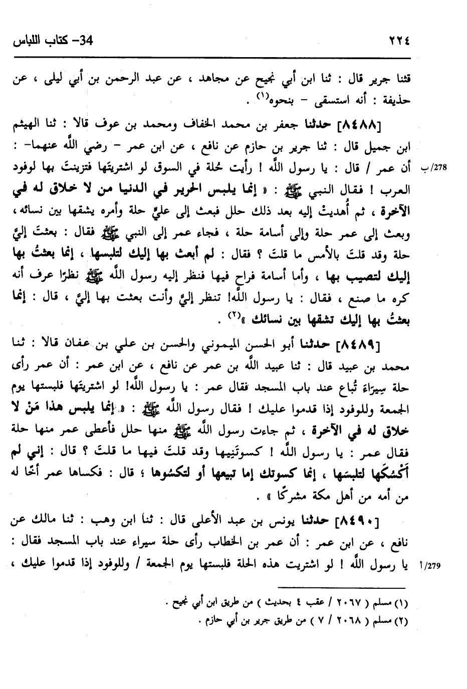 8488 - حَدَّثَنَا جَعْفَرُ بْنُ مُحَمَّدٍ الْخَفَّافُ، وَمُحَمَّدُ بْنُ عَوْفٍ، قَالَا: ثَنَا الْهَيْثَمُ بْنُ جَمِيلٍ، قَالَ: ثَنَا جَرِيرُ بْنُ حَازِمٍ، عَنْ نَافِعٍ، عَنِ ابْنِ عُمَرَ رَضِيَ اللَّهُ عَنْهُمَا، أَنَّ عُمَرَ، قَالَ: يَا رَسُولَ اللَّهِ، رَأَيْتُ حُلَّةً فِي السُّوقِ، لَوِ اشْتَرَيْتَهَا، فَتَزَيَّنْتَ بِهَا لِوُفُودِ الْعَرَبِ، فَقَالَ: النَّبِيُّ صَلَّى اللهُ عَلَيْهِ وَسَلَّمَ: «§إِنَّمَا يَلْبَسُ الْحَرِيرَ فِي الدُّنْيَا، مَنْ لَا خَلَاقَ لَهُ، فِي الْآخِرَةِ» ، ثُمَّ أُهْدِيَتْ إِلَيْهِ بَعْدَ ذَلِكَ حُلَلٌ، فَبَعَثَ إِلَى عَلِيٍّ حُلَّةً، وَأَمَرَهُ يَشُقُّهَا بَيْنَ نِسَائِهِ، وَبَعَثَ إِلَى عُمَرَ حُلَّةً، وَإِلَى أُسَامَةَ حُلَّةً، فَجَاءَ عُمَرُ إِلَى النَّبِيِّ صَلَّى اللهُ عَلَيْهِ وَسَلَّمَ، فَقَالَ: بَعَثْتَ إِلَيَّ حُلَّةً، وَقَدْ قُلْتَ بِالْأَمْسِ مَا قُلْتَ، فَقَالَ: «لَمْ أَبْعَثْ بِهَا إِلَيْكَ لِتَلْبَسَهَا، إِنَّمَا بَعَثْتُ بِهَا إِلَيْكَ لِتُصِيبَ بِهَا» ، وَأَمَّا أُسَامَةُ فَرَاحَ فِيهَا، فَنَظَرَ إِلَيْهِ رَسُولُ اللَّهِ صَلَّى اللهُ عَلَيْهِ وَسَلَّمَ، نَظَرًا عَرَفَ أَنَّهُ كَرِهَ مَا صَنَعَ، فَقَالَ: يَا رَسُولَ اللَّهِ تَنْظُرُ إِلَيَّ، وَأَنْتَ بَعَثْتَ بِهَا إِلَيَّ؟، قَالَ: «إِنَّمَا بَعَثْتُ بِهَا إِلَيْكَ تَشُقَّهَا بَيْنَ نِسَائِكَ»