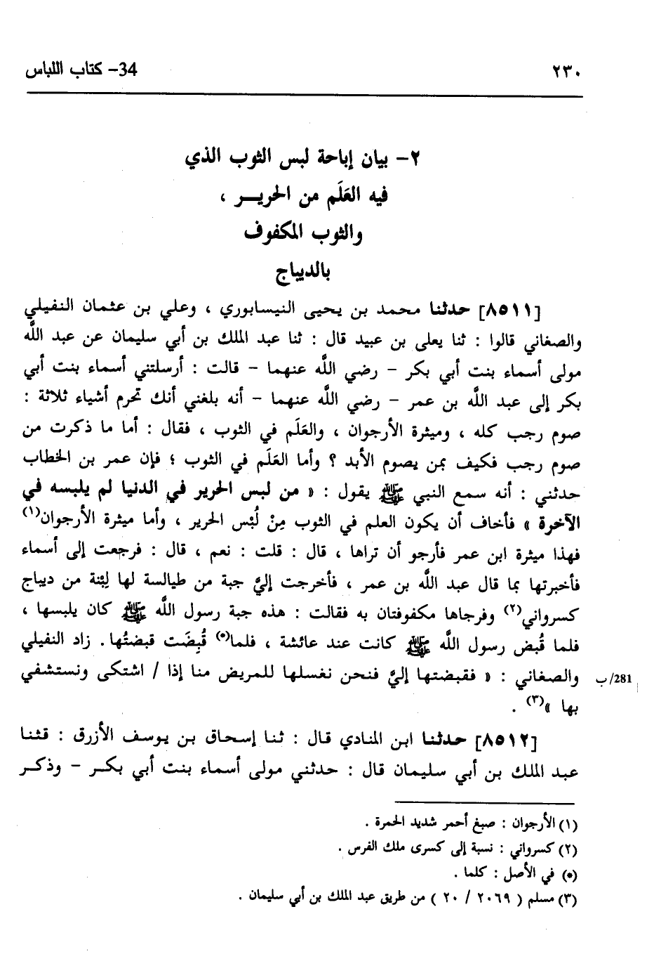 8511 - حَدَّثَنَا مُحَمَّدُ بْنُ يَحْيَى النَّيْسَابُورِيُّ، وَعَلِيُّ بْنُ عُثْمَانَ النُّفَيْلِيُّ، وَالصَّغَانِيُّ، قَالُوا: ثَنَا يَعْلَى بْنُ عُبَيْدِ، قَالَ: ثَنَا عَبْدُ الْمَلِكِ بْنُ أَبِي سُلَيْمَانَ، عَنْ عَبْدِ اللَّهِ، مَوْلَى أَسْمَاءَ بِنْتِ أَبِي بَكْرٍ رَضِيَ اللَّهُ عَنْهُمَا، قَالَتْ: أَرْسَلَتْنِي أَسْمَاءُ بِنْتُ أَبِي بَكْرٍ، إِلَى عَبْدِ اللَّهِ بْنِ عُمَرَ رَضِيَ اللَّهُ عَنْهُمَا، أَنَّهُ بَلَغَنِي أَنَّكَ §تُحَرِّمُ أَشْيَاءً ثَلَاثَةً: صَوْمُ رَجَبٍ كُلَّهُ، وَمِيثَرَةَ الْأُرْجُوَانِ، وَالْعَلَمَ فِي الثَّوْبِ؟، فَقَالَ: أَمَّا مَا ذَكَرْتِ مِنْ صَوْمِ رَجَبٍ، فَكَيْفَ بِمَنْ يَصُومُ الْأَبَدَ؟، وَأَمَّا الْعَلَمُ فِي الثَّوْبِ فَإِنَّ عُمَرَ بْنَ الْخَطَّابِ، حَدَّثَنِي أَنَّهُ سَمِعَ النَّبِيَّ صَلَّى اللهُ عَلَيْهِ وَسَلَّمَ، يَقُولُ: «مَنْ لَبِسَ الْحَرِيرَ فِي الدُّنْيَا، لَمْ يَلْبَسْهُ فِي الْآخِرَةِ» ، فَأَخَافُ أَنْ يَكُونَ الْعَلَمُ فِي الثَّوْبِ، مِنْ لُبْسِ الْحَرِيرِ، وَأَمَّا مِيثَرَةُ الْأُرْجُوَانِ، فَهَذَا مِيثَرَةُ ابْنُ عُمَرَ، فَأَرْجُو أَنْ تَرَاهَا. قَالَ: قُلْتُ: نَعَمْ، قَالَ: فَرَجَعْتُ إِلَى أَسْمَاءَ فَأَخْبَرْتُهَا بِمَا قَالَ: عَبْدُ اللَّهِ بْنُ عُمَرَ، فَأَخْرَجَتْ إِلَيَّ جُبَّةٌ مِنْ طَيَالِسَةٍ لَهَا لَبِنَةٌ مِنْ دِيبَاجٍ كِسْرَوَانِيٍّ، وَفَرْجَاهَا مَكْفُوفَتَانِ بِهِ، فَقَالَتْ هَذِهِ جُبَّةُ رَسُولِ اللَّهِ صَلَّى اللهُ عَلَيْهِ وَسَلَّمَ، كَانَ يَلْبَسُهَا، فَلَمَّا قُبِضَ رَسُولُ اللَّهِ صَلَّى اللهُ عَلَيْهِ وَسَلَّمَ كَانَتْ عِنْدَ عَائِشَةَ، فَلَمَّا قُبِضَتْ قَبَضْتُهَا. زَادَ النُّفَيْلِيُّ، وَالصَّغَانِيُّ، فَقَبَضْتُهَا إِلَيَّ، فَنَحْنُ نَغْسِلُهَا لِلْمَرِيضِ مِنَّا إِذَا اشْتَكَى، وَنَسْتَشْفِي بِهَا،