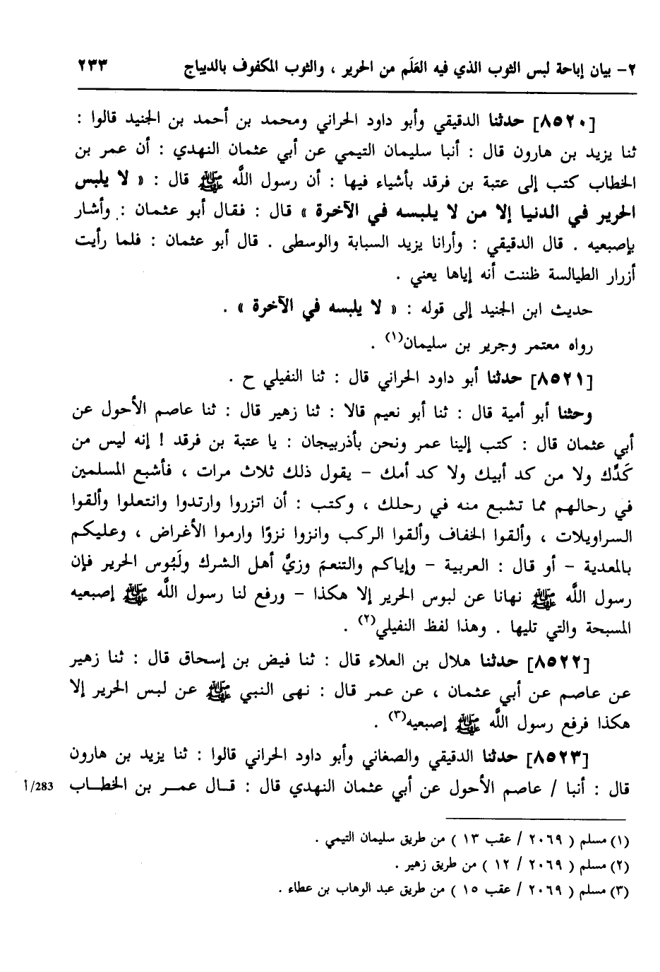 8520 - حَدَّثَنَا الدَّقِيقِيُّ، وَأَبُو دَاوُدَ الْحَرَّانِيُّ، وَمُحَمَّدُ بْنُ أَحْمَدَ بْنِ الْجُنَيْدِ، قَالُوا: ثَنَا يَزِيدُ بْنُ هَارُونَ، قَالَ: أَنْبَأَ سُلَيْمَانُ التَّيْمِيُّ، عَنْ أَبِي عُثْمَانَ النَّهْدِيِّ، أَنَّ عُمَرَ بْنَ الْخَطَّابِ، كَتَبَ إِلَى عُتْبَةَ بْنِ فَرْقَدٍ، بِأَشْيَاءً فِيهَا أَنَّ رَسُولَ اللَّهِ صَلَّى اللهُ عَلَيْهِ وَسَلَّمَ، قَالَ: «§لَا يَلْبَسُ الْحَرِيرَ فِي الدُّنْيَا، إِلَّا مَنْ لَا يَلْبَسْهُ فِي الْآخِرَةِ» ، قَالَ: فَقَالَ: أَبُو عُثْمَانَ، وَأَشَارَ بِإِصْبَعَيْهِ، قَالَ الدَّقِيقِيُّ: وَأَرَانَا يَزِيدُ السَّبَّابَةَ، وَالْوُسْطَى، قَالَ: أَبُو عُثْمَانَ فَلَمَّا رَأَيْتُ أَزْرَارَ الطَّيَالِسَةِ، ظَنَنْتُ أَنَّهُ إِيَّاهَا يَعْنِي حَدِيثَ ابْنَ الْجُنَيْدِ إِلَى قَوْلِهِ: «لَا يَلْبَسْهُ فِي الْآخِرَةِ» ، رَوَاهُ مُعْتَمِرٌ، وَجَرِيرُ بْنُ سُلَيْمَانَ