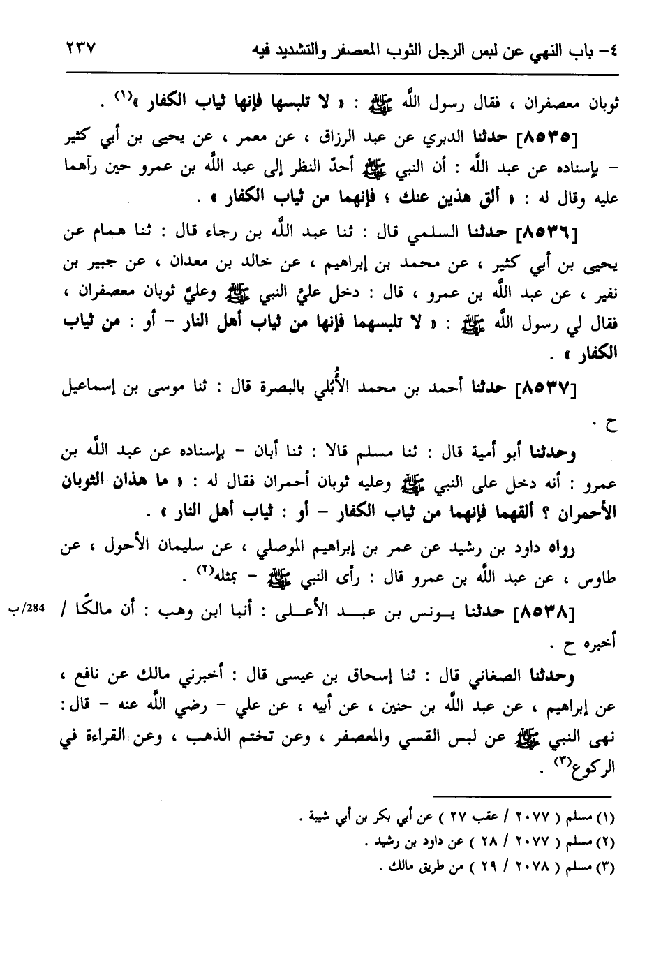 8536 - حَدَّثَنَا السُّلَمِيُّ، قَالَ: ثَنَا عَبْدُ اللَّهِ بْنُ رَجَاءٍ، قَالَ: ثَنَا هَمَّامٌ، عَنْ يَحْيَى بْنِ أَبِي كَثِيرٍ، عَنْ مُحَمَّدِ بْنِ إِبْرَاهِيمَ، عَنْ خَالِدِ بْنِ مَعْدَانَ، عَنْ جُبَيْرِ بْنِ نُفَيْرٍ، عَنْ عَبْدِ اللَّهِ بْنِ عَمْرٍو، قَالَ: دَخَلَ عَلِيَّ النَّبِيُّ صَلَّى اللهُ عَلَيْهِ وَسَلَّمَ، وَعَلِيَّ ثَوْبَانِ مُعَصْفَرَانِ، فَقَالَ لِي رَسُولُ اللَّهِ صَلَّى اللهُ عَلَيْهِ وَسَلَّمَ: «§لَا تَلْبَسْهُمَا، فَإِنَّهَا مِنْ ثِيَابِ أَهْلِ النَّارِ، أَوْ مِنْ ثِيَابِ الْكُفَّارِ»