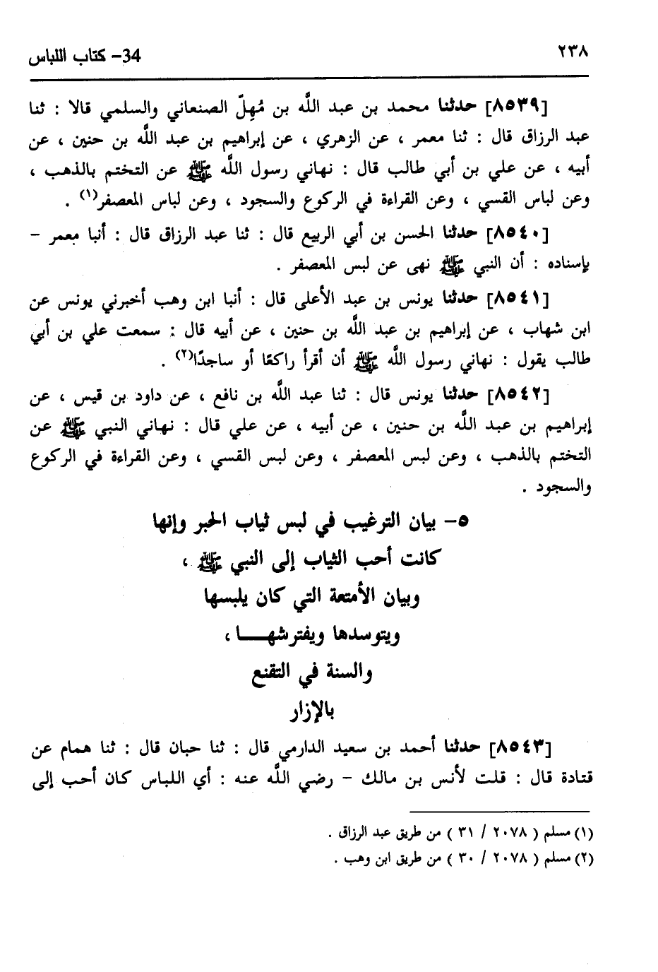 8539 - حَدَّثَنَا مُحَمَّدُ بْنُ عَبْدِ اللَّهِ بْنِ مُهَلٍّ الصَّنْعَانِيُّ، وَالسُّلَمِيُّ، قَالَا: ثَنَا عَبْدُ الرَّزَّاقِ، قَالَ: ثَنَا مَعْمَرٌ، عَنِ الزُّهْرِيِّ، عَنْ إِبْرَاهِيمَ بْنِ عَبْدِ اللَّهِ بْنِ حُنَيْنٍ، عَنْ أَبِيهِ، عَنْ عَلِيِّ بْنِ أَبِي طَالِبٍ، قَالَ: «§نَهَانِي رَسُولُ اللَّهِ صَلَّى اللهُ عَلَيْهِ وَسَلَّمَ، عَنِ التَّخَتُّمِ بِالذَّهَبِ، وَعَنْ لِبَاسِ الْقَسِّيِّ، وَعَنِ الْقِرَاءَةِ فِي الرُّكُوعِ، وَالسُّجُودِ، وَعَنْ لِبَاسِ الْمُعَصْفَرِ»