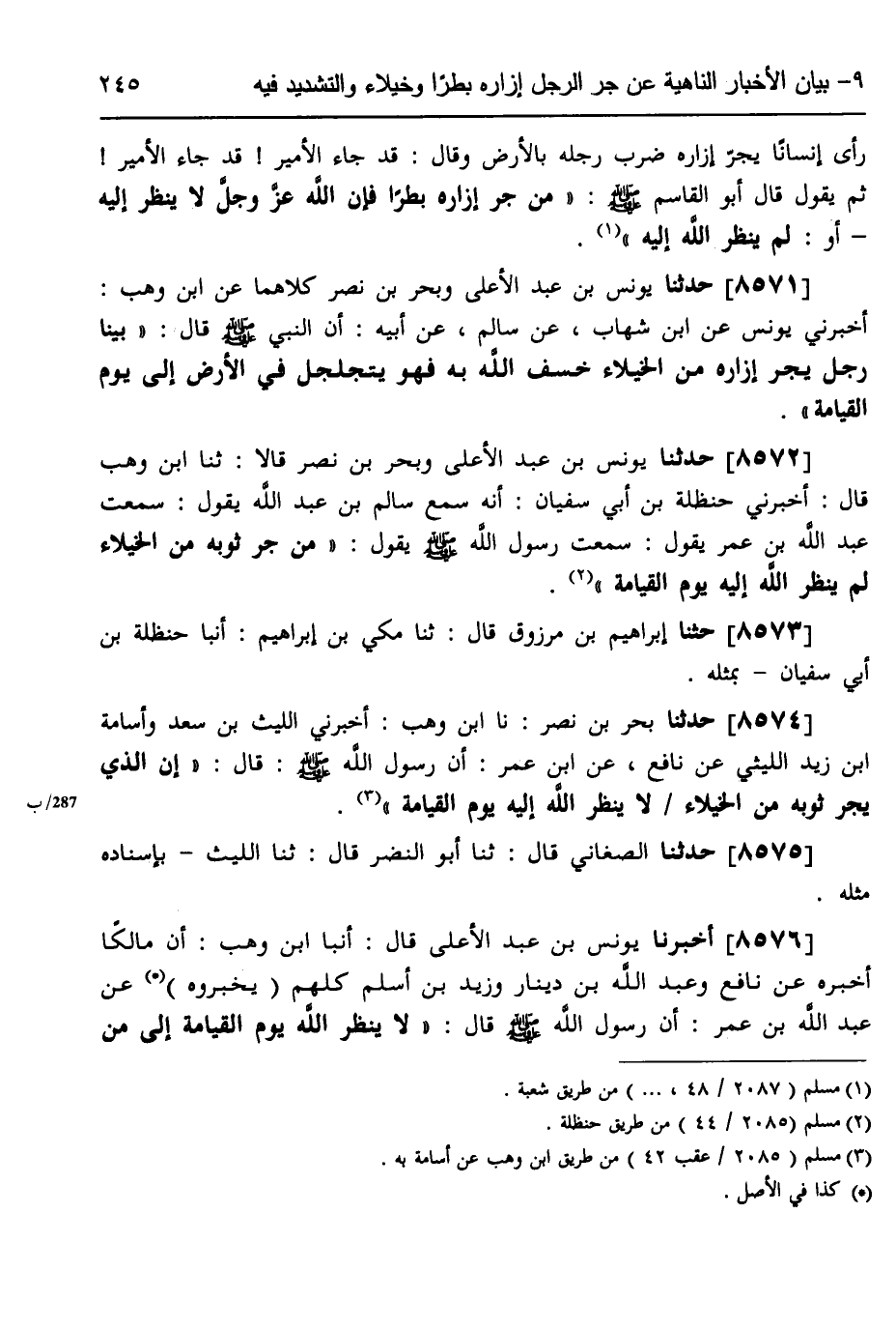 8571 - حَدَّثَنَا يُونُسُ بْنُ عَبْدِ الْأَعْلَى، وَبَحْرُ بْنُ نَصْرٍ، كِلَاهُمَا، عَنِ ابْنِ وَهْبٍ، أَخْبَرَنِي يُونُسُ، عَنِ ابْنِ شِهَابٍ، عَنْ سَالِمٍ، عَنْ أَبِيهِ، أَنَّ النَّبِيَّ صَلَّى اللهُ عَلَيْهِ وَسَلَّمَ، قَالَ: «§بَيْنَا رَجُلٌ يَجُرُّ إِزَارَهُ، مِنَ الْخُيَلَاءِ، خَسَفَ اللَّهُ بِهِ، فَهُوَ يَتَجَلْجَلُ فِي الْأَرْضِ إِلَى يَوْمِ الْقِيَامَةِ»