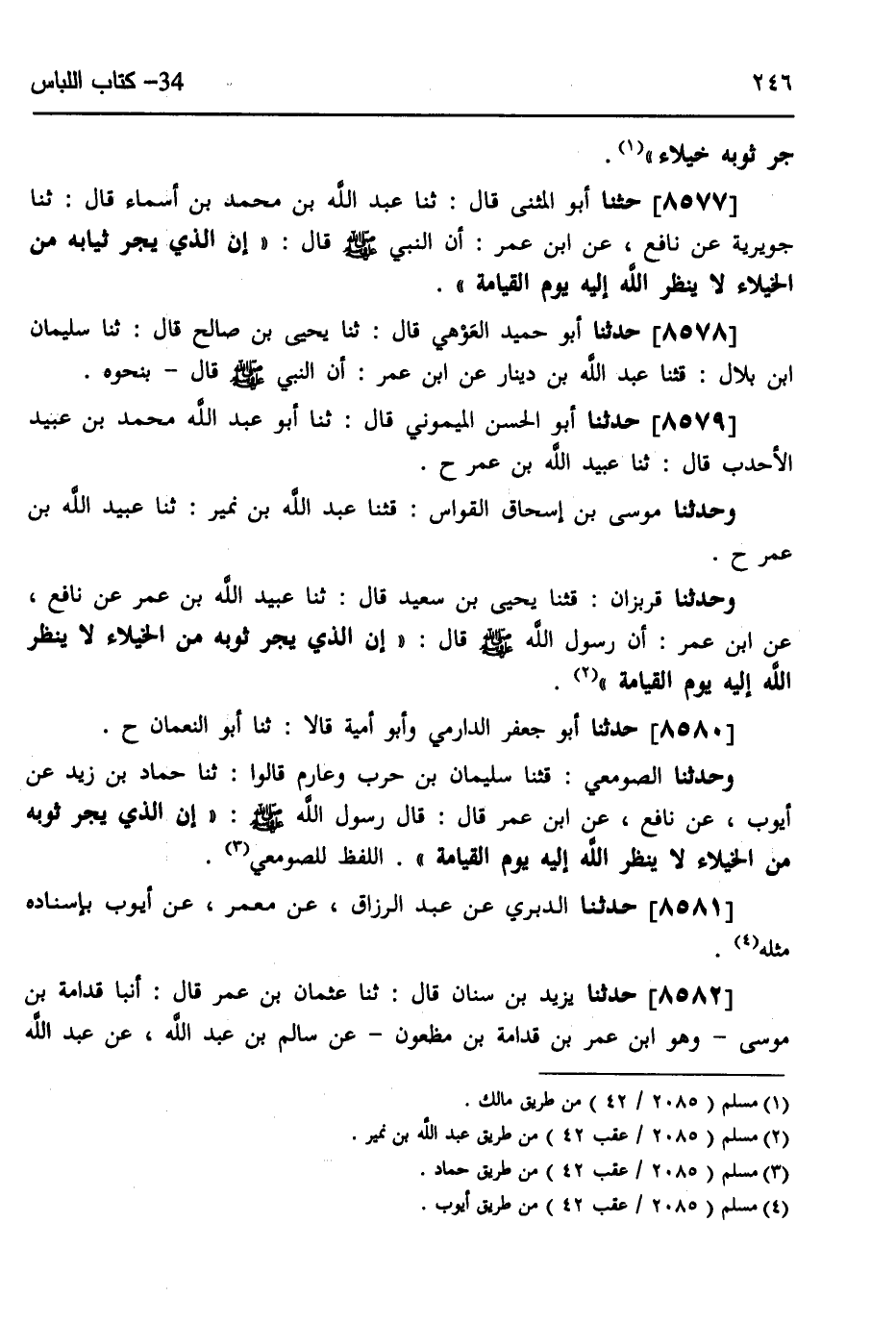 8580 - حَدَّثَنَا أَبُو جَعْفَرٍ الدَّارِمِيُّ، وَأَبُو أُمَيَّةَ، قَالَا: ثَنَا أَبُو النُّعْمَانِ، ح، وَحَدَّثَنَا الصَّوْمَعِيُّ، قثنا سُلَيْمَانُ بْنُ حَرْبٍ، وَعَارِمٌ، قَالُوا: ثَنَا حَمَّادُ بْنُ زَيْدٍ، عَنْ أَيُّوبَ، عَنْ نَافِعٍ، عَنِ ابْنِ عُمَرَ، قَالَ: قَالَ رَسُولُ اللَّهِ صَلَّى اللهُ عَلَيْهِ وَسَلَّمَ: «§إِنَّ الَّذِي يَجُرُّ ثَوْبَهُ، مِنَ الْخُيَلَاءِ لَا يَنْظُرُ اللَّهُ إِلَيْهِ، يَوْمَ الْقِيَامَةِ» اللَّفْظُ لِلصَّوْمَعِيِّ،