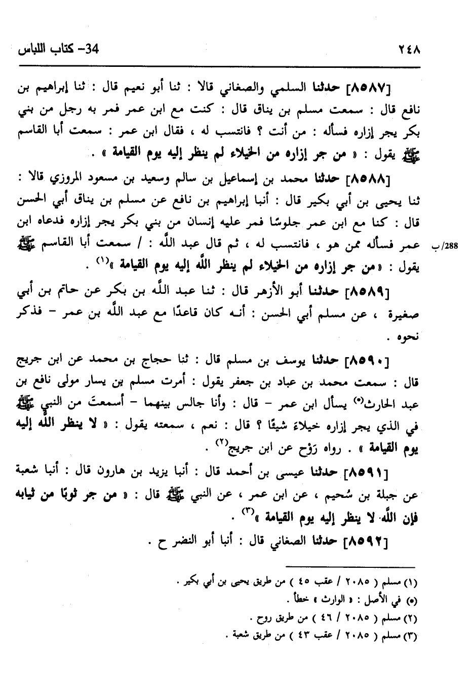 8587 - حَدَّثَنَا السُّلَمِيُّ، وَالصَّغَانِيُّ، قَالَا: ثَنَا أَبُو نُعَيْمٍ، قَالَ: ثَنَا إِبْرَاهِيمُ بْنُ نَافِعٍ، قَالَ: سَمِعْتُ مُسْلِمَ بْنَ يَنَّاقٍ، قَالَ: كُنْتُ مَعَ ابْنِ عُمَرَ، فَمَرَّ بِهِ رَجُلٌ مَنْ بَنِي بَكْرٍ يَجُرُّ إِزَارَهُ، فَسَأَلَهُ: مَنْ أَنْتَ؟، فَانْتَسَبَ لَهُ، فَقَالَ: ابْنُ عُمَرَ سَمِعْتُ أَبَا الْقَاسِمِ صَلَّى اللهُ عَلَيْهِ وَسَلَّمَ، يَقُولُ: «§مَنْ جَرَّ إِزَارَهُ، مِنَ الْخُيَلَاءِ، لَمْ يُنْظَرْ إِلَيْهِ يَوْمَ الْقِيَامَةِ»