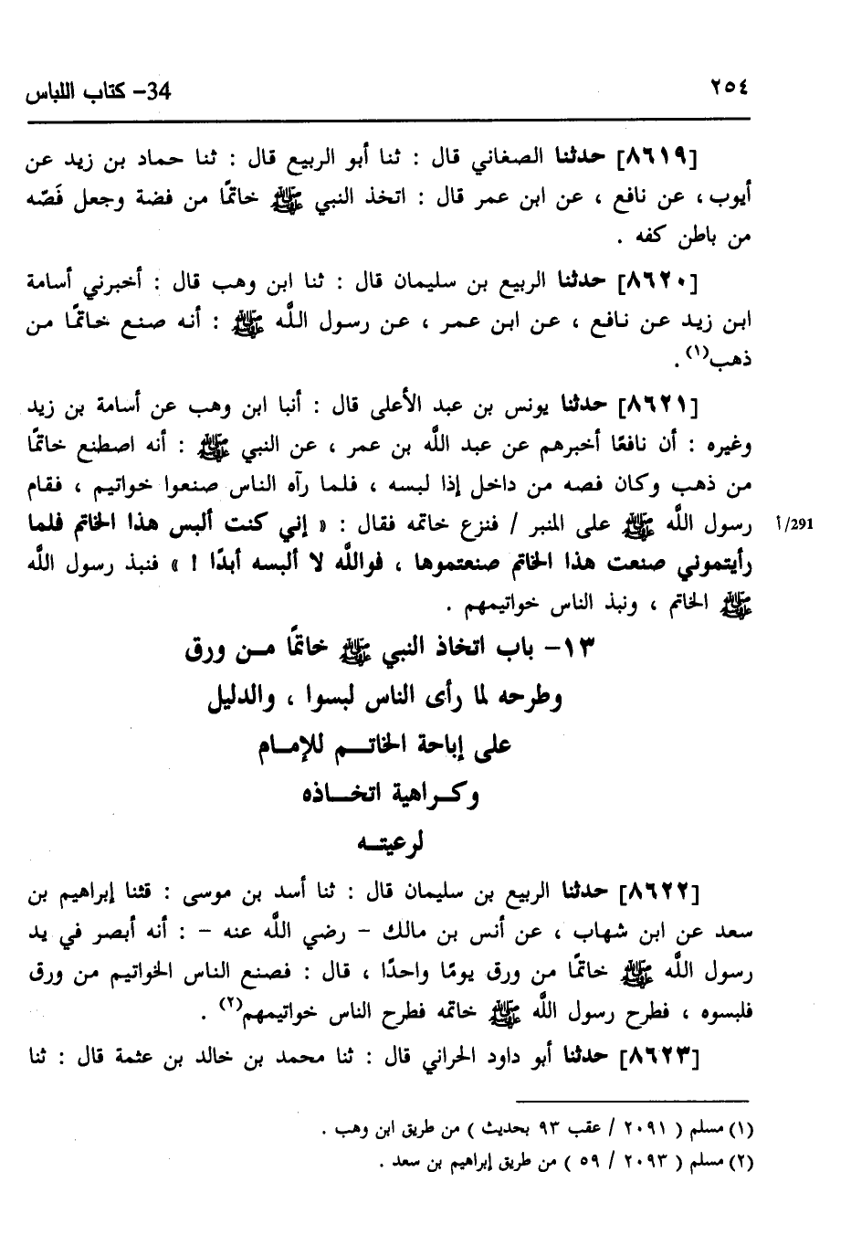 8619 - حَدَّثَنَا الصَّغَانِيُّ، قَالَ: ثَنَا أَبُو الرَّبِيعِ، قَالَ: ثَنَا حَمَّادُ بْنُ زَيْدٍ، عَنْ أَيُّوبَ، عَنْ نَافِعٍ، عَنِ ابْنِ عُمَرَ، قَالَ: «§اتَّخَذَ النَّبِيُّ صَلَّى اللهُ عَلَيْهِ وَسَلَّمَ، خَاتَمًا مَنْ فِضَّةٍ، وَجَعَلَ فَصَّهُ مَنْ بَاطِنِ كَفِّهِ» ،