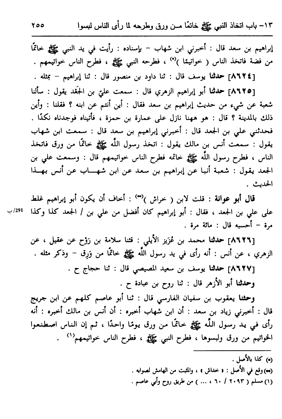 8627 - حَدَّثَنَا يُوسُفُ بْنُ سَعِيدٍ الْمِصِّيصِيُّ، قَالَ: ثَنَا حَجَّاجٌ، ح، وَحَدَّثَنَا أَبُو الْأَزْهَرِ، قَالَ: ثَنَا رَوْحُ بْنُ عُبَادَةَ، ح، وحثنا يَعْقُوبُ بْنُ سُفْيَانَ الْفَارِسِيُّ، قَالَ: ثَنَا أَبُو عَاصِمٍ، كُلُّهُمْ عَنِ ابْنِ جُرَيْجٍ، قَالَ: أَخْبَرَنِي زِيَادُ بْنُ سَعْدٍ، أَنَّ ابْنَ شِهَابٍ، أَخْبَرَهُ أَنَّ أَنَسَ بْنَ مَالِكٍ أَخْبَرَهُ أَنَّهُ، «§رَأَى فِي يَدِ رَسُولِ اللَّهِ صَلَّى اللهُ عَلَيْهِ وَسَلَّمَ، خَاتَمًا مَنْ وَرِقٍ يَوْمًا وَاحِدًا، ثُمَّ إِنَّ النَّاسَ اصْطَنَعُوا الْخَوَاتِيمَ مَنْ وَرِقٍ، وَلَبِسُوهَا، فَطَرَحَ النَّبِيُّ صَلَّى اللهُ عَلَيْهِ وَسَلَّمَ، فَطَرَحَ النَّاسُ خَوَاتِيمَهُمْ»