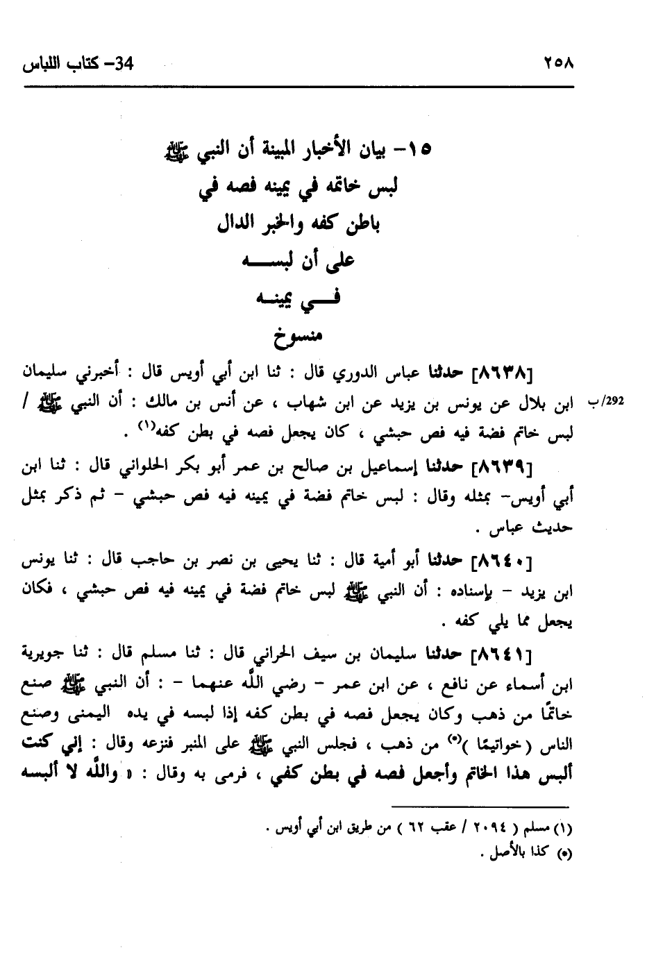 §بَيَانُ الْأَخْبَارِ الْمُبَيَّنَةِ، أَنَّ النَّبِيَّ صَلَّى اللهُ عَلَيْهِ وَسَلَّمَ، لَبِسَ خَاتَمَهُ فِي يَمِينِهِ، فَصَّهُ فِي بَاطِنِ كَفِّهِ، وَالْخَبَرِ الدَّالِّ عَلَى أَنَّ لُبْسَهُ فِي يَمِينِهِ مَنْسُوخٌ