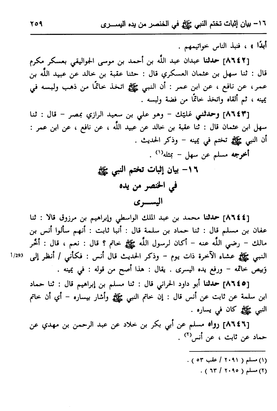 8643 - وَحَدَّثَنِي عُلَيَّكُ وَهُوَ عَلِيُّ بْنُ سَعِيدٍ الرَّازِيُّ بِمِصْرَ، قَالَ: ثَنَا سَهْلُ بْنُ عُثْمَانَ، قَالَ: ثَنَا عُقْبَةُ بْنُ خَالِدٍ، عَنْ عُبَيْدِ اللَّهِ، عَنْ نَافِعٍ، عَنِ ابْنِ عُمَرَ، «أَنَّ §النَّبِيَّ صَلَّى اللهُ عَلَيْهِ وَسَلَّمَ، تَخَتَّمَ فِي يَمِينِهِ» ، وَذَكَرَ الْحَدِيثَ، أَخْرَجَهُ مُسْلِمٌ، عَنْ سَهْلٍ بِمِثْلِهِ.