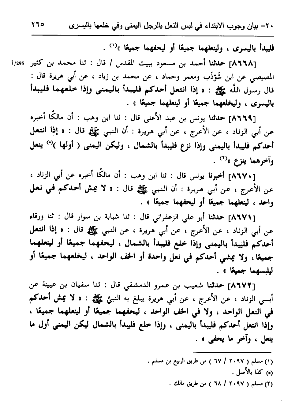 8672 - حَدَّثَنَا شُعَيْبُ بْنُ عَمْرٍو الدِّمَشْقِيُّ، قَالَ: ثَنَا سُفْيَانُ بْنُ عُيَيْنَةَ، عَنْ أَبِي الزِّنَادِ، عَنِ الْأَعْرَجِ، عَنْ أَبِي هُرَيْرَةَ، يَبْلُغُ بِهِ النَّبِيَّ صَلَّى اللهُ عَلَيْهِ وَسَلَّمَ: «§لَا يَمْشِ أَحَدُكُمْ فِي النَّعْلِ الْوَاحِدِ، وَلَا فِي الْخُفِّ الْوَاحِدِ لِيُحْفِهِمَا جَمِيعًا، أَوْ لِيُنْعِلْهُمَا جَمِيعًا، وَإِذَا انْتَعَلَ أَحَدُكُمْ، فَلْيَبْدَأْ بِالْيُمْنَى، وَإِذَا خَلَعَ، فَلْيَبْدَأْ بِالشِّمَالِ، لِيَكُنِ الْيُمْنَى أَوَّلَ مَا يُنْعَلُ، وَآخَرَ مَا يُحْفِي»