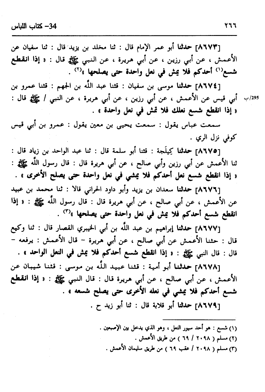 8677 - حَدَّثَنَا إِبْرَاهِيمُ بْنُ عَبْدِ اللَّهِ بْنِ أَبِي الْخَيْبَرِيُّ الْقِصَارُ، قَالَ: ثَنَا وَكِيعٌ، قَالَ: حثنا الْأَعْمَشُ، عَنْ أَبِي صَالِحٍ، عَنْ أَبِي هُرَيْرَةَ، قَالَ: الْأَعْمَشُ يَرْفَعْهُ، قَالَ: قَالَ النَّبِيُّ صَلَّى اللهُ عَلَيْهِ وَسَلَّمَ: «§إِذَا انْقَطَعَ شِسْعُ أَحَدِكُمْ، فَلَا يَمْشِ فِي النَّعْلِ الْوَاحِدِ»
