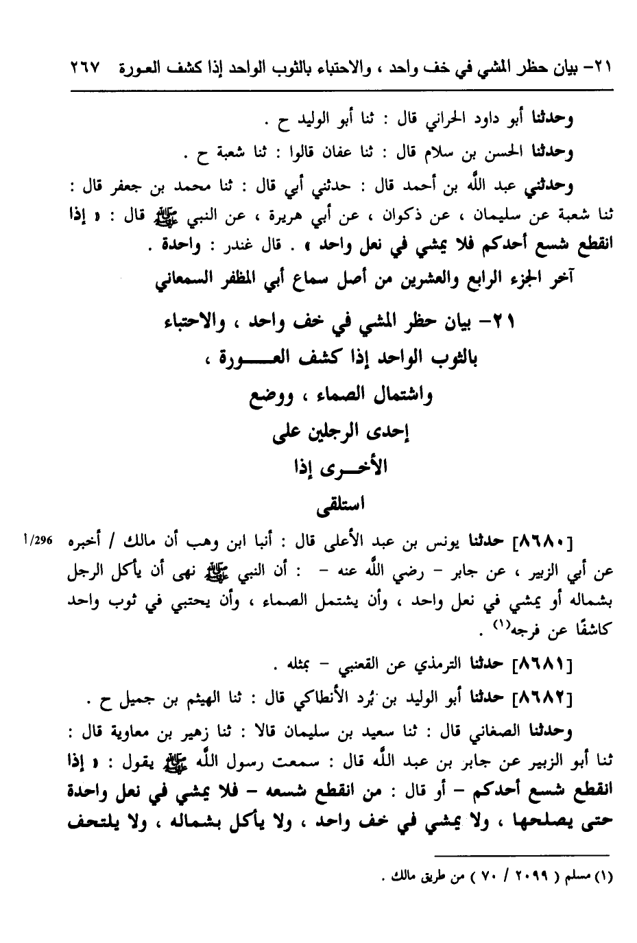 8682 - حَدَّثَنَا أَبُو الْوَلِيدِ بْنُ بُرْدٍ الْأَنْطَاكِيُّ، قَالَ: ثَنَا الْهَيْثَمُ بْنُ جَمِيلٍ، ح، وَحَدَّثَنَا الصَّغَانِيُّ، قَالَ: ثَنَا سَعِيدُ بْنُ سُلَيْمَانَ، قَالَا: ثَنَا زُهَيْرُ بْنُ مُعَاوِيَةَ، قَالَ: ثَنَا أَبُو الزُّبَيْرِ، عَنْ جَابِرِ بْنِ عَبْدِ اللَّهِ، قَالَ: سَمِعْتُ رَسُولَ اللَّهِ صَلَّى اللهُ عَلَيْهِ وَسَلَّمَ، يَقُولُ: " §إِذَا انْقَطَعَ شِسْعُ أَحَدِكُمْ، أَوْ قَالَ: مَنِ انْقَطَعَ شِسْعَهُ، فَلَا يَمْشِي فِي نَعْلٍ وَاحِدَةٍ، حَتَّى يُصْلِحَهَا، ولَا يَمْشِي فِي خُفٍّ وَاحِدٍ، وَلَا يَأْكُلُ بِشِمَالِهِ، وَلَا يَلْتَحِفُ -[268]- الصَّمَّاءَ "، زَادَ الصَّغَانِيُّ: «وَلَا يَحْتَبِي بِثَوْبٍ وَاحِدٍ»