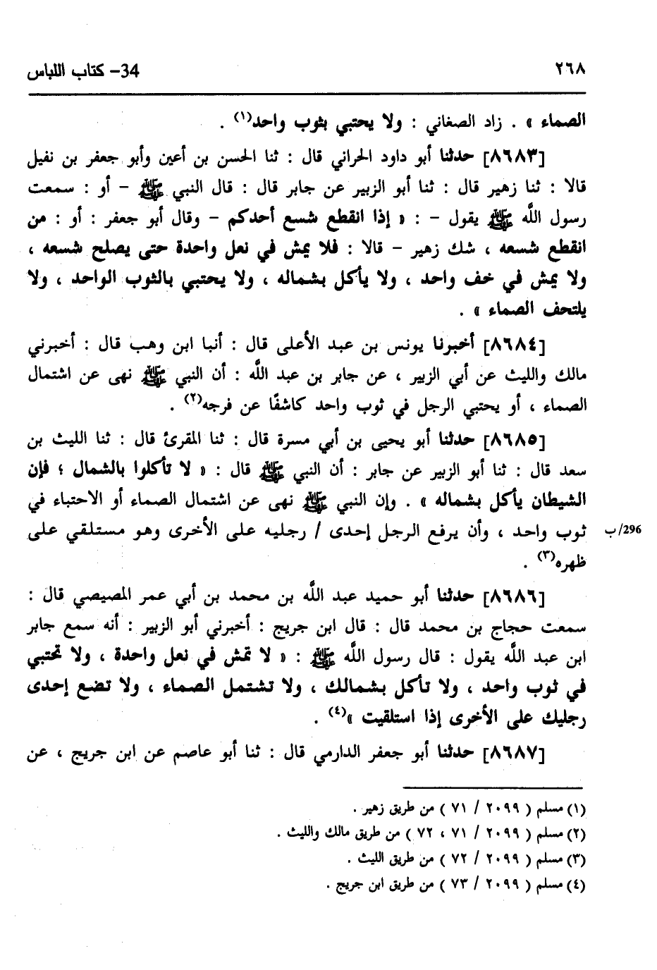 8686 - حَدَّثَنَا أَبُو حُمَيْدٍ عَبْدُ اللَّهِ بْنُ مُحَمَّدِ بْنِ أَبِي عُمَرَ الْمِصِّيصِيُّ، قَالَ: سَمِعْتُ حَجَّاجَ بْنَ مُحَمَّدٍ، قَالَ: قَالَ ابْنُ جُرَيْجٍ: أَخْبَرَنِي أَبُو الزُّبَيْرِ، أَنَّهُ سَمِعَ جَابِرَ بْنَ عَبْدِ اللَّهِ، يَقُولُ: قَالَ رَسُولُ اللَّهِ صَلَّى اللهُ عَلَيْهِ وَسَلَّمَ: «§لَا تَمْشِ فِي نَعْلٍ وَاحِدَةٍ، وَلَا تَحْتَبِي فِي ثَوْبٍ وَاحِدٍ، وَلَا تَأْكُلْ بِشِمَالِكَ، وَلَا تَشْتَمِلِ الصَّمَّاءَ، وَلَا تَضَعْ إِحْدَى رِجْلَيْكَ عَلَى الْأُخْرَى إِذَا اسْتَلْقَيْتَ» ،