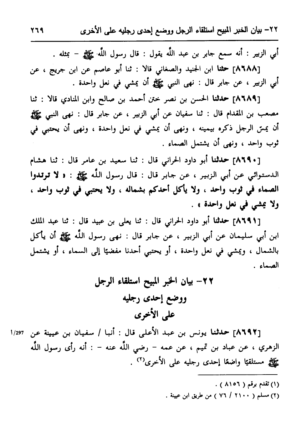 8689 - حَدَّثَنَا الْحَسَنُ بْنُ نُصَيْرٍ خَتَنُ أَحْمَدَ بْنِ صَالِحٍ، وَابْنُ الْمُنَادِي، قَالَا: ثَنَا مُصْعَبُ بْنُ الْمِقْدَامِ، قَالَ: ثَنَا سُفْيَانُ، عَنْ أَبِي الزُّبَيْرِ، عَنْ جَابِرٍ، قَالَ: «§نَهَى النَّبِيُّ صَلَّى اللهُ عَلَيْهِ وَسَلَّمَ، أَنْ يَمَسَّ الرَّجُلُ ذَكَرَهُ بِيَمِينِهِ، وَنَهَى أَنْ يَمْشِيَ فِي نَعْلٍ وَاحِدَةٍ، وَنَهَى أَنْ يَحْتَبِيَ فِي ثَوْبٍ وَاحِدٍ، وَنَهَى أَنْ يَشْتَمِلَ الصَّمَّاءَ»