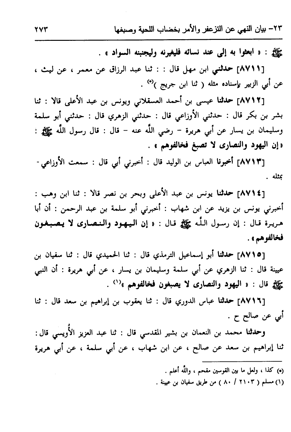 8715 - حَدَّثَنَا أَبُو إِسْمَاعِيلَ التِّرْمِذِيُّ، قَالَ: ثَنَا الْحُمَيْدِيُّ، قَالَ: ثَنَا سُفْيَانُ بْنُ عُيَيْنَةَ، قَالَ: ثَنَا الزُّهْرِيُّ، عَنْ أَبِي سَلَمَةَ، وَسُلَيْمَانَ بْنَ يَسَارٍ، عَنْ أَبِي هُرَيْرَةَ: أَنَّ النَّبِيَّ صَلَّى اللهُ عَلَيْهِ وَسَلَّمَ، قَالَ: «§الْيَهُودُ، وَالنَّصَارَى لَا يَصْبُغُونَ، فَخَالِفُوهُمْ»
