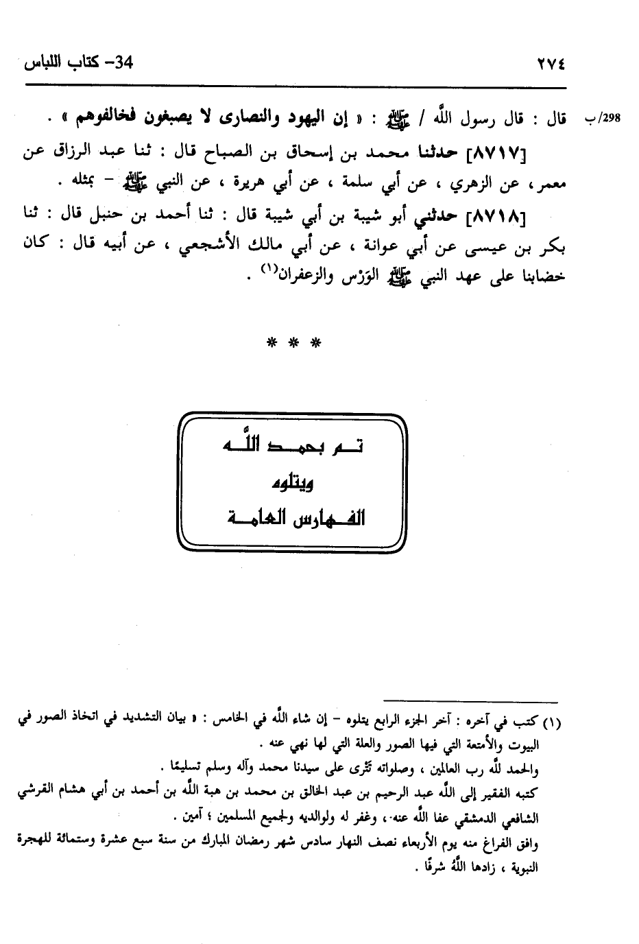 8718 - حَدَّثَنِي أَبُو شَيْبَةَ بْنُ أَبِي شَيْبَةَ، قَالَ: ثَنَا أَحْمَدُ بْنُ حَنْبَلٍ، قَالَ: ثَنَا بَكْرُ بْنُ عِيسَى، عَنْ أَبِي عَوَانَةَ، عَنْ أَبِي مَالِكٍ الْأَشْجَعِيِّ، عَنْ أَبِيهِ، قَالَ: «كَانَ §خِضَابُنَا عَلَى عَهْدِ النَّبِيِّ صَلَّى اللهُ عَلَيْهِ وَسَلَّمَ، الْوَرْسَ، وَالزَّعْفَرَانَ»