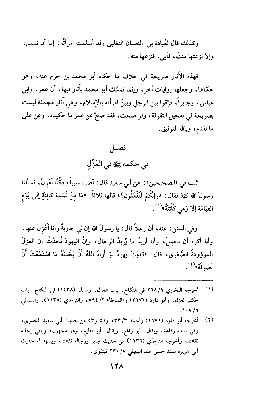 وَفِي السُّنَنِ عَنْهُ ( «أَنَّ رَجُلًا قَالَ يَا رَسُولَ اللَّهِ صَلَّى اللَّهُ عَلَيْهِ وَسَلَّمَ إِنَّ لِي جَارِيَةً وَأَنَا أَعْزِلُ عَنْهَا، وَأَنَا أَكْرَهُ أَنْ تَحْمِلَ، وَأَنَا أُرِيدُ مَا يُرِيدُ الرِّجَالُ، وَإِنَّ الْيَهُودَ تُحَدِّثُ أَنَّ الْعَزْلَ الْمَوْءُودَةُ الصُّغْرَى، قَالَ: " كَذَبَتْ يَهُودُ لَوْ أَرَادَ اللَّهُ أَنْ يَخْلُقَهُ مَا اسْتَطَعْتَ أَنْ تَصْرِفَهُ» ) .