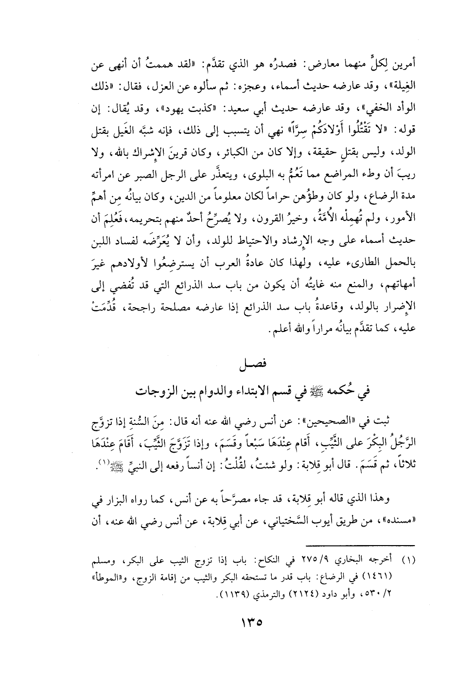 أَمْرَيْنِ لِكُلٍّ مِنْهُمَا مُعَارِضٌ فَصَدْرُهُ هُوَ الَّذِي تَقَدَّمَ: ( «لَقَدْ هَمَمْتُ أَنْ أَنْهَى عَنِ الْغِيلَةِ» ) وَقَدْ عَارَضَهُ حَدِيثُ أسماء، وَعَجُزُهُ: ثُمَّ سَأَلُوهُ عَنِ الْعَزْلِ، فَقَالَ: ( «ذَلِكَ الْوَأْدُ الْخَفِيُّ» ) وَقَدْ عَارَضَهُ حَدِيثُ أبي سعيد: ( «كَذَبَتْ يَهُودُ» ) ، وَقَدْ يُقَالُ إِنَّ قَوْلَهُ: ( «لَا تَقْتُلُوا أَوْلَادَكُمْ سِرًّا» ) نَهْيٌ أَنْ يَتَسَبَّبَ إِلَى ذَلِكَ، فَإِنَّهُ شَبَّهَ الْغَيْلَ بِقَتْلِ الْوَلَدِ، وَلَيْسَ بِقَتْلٍ حَقِيقَةً، وَإِلَّا كَانَ مِنَ الْكَبَائِرِ، وَكَانَ قَرِينَ الْإِشْرَاكِ بِاللَّهِ.