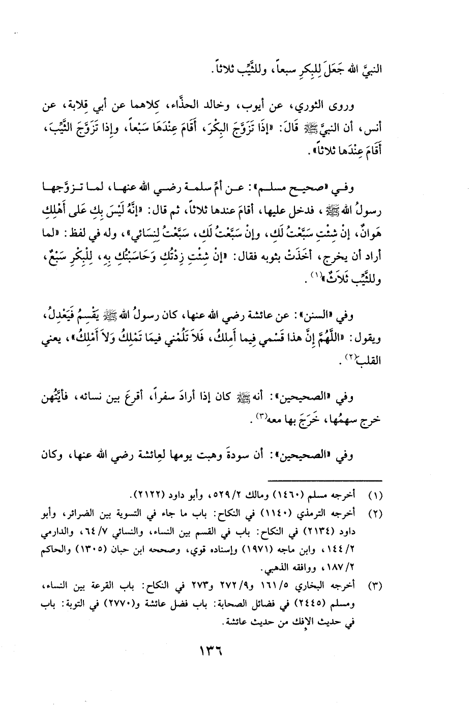 وَفِي " صَحِيحِ مسلم ": عَنْ ( «أم سلمة رَضِيَ اللَّهُ عَنْهَا لَمَّا تَزَوَّجَهَا رَسُولُ اللَّهِ صَلَّى اللَّهُ عَلَيْهِ وَسَلَّمَ فَدَخَلَ عَلَيْهَا أَقَامَ عِنْدَهَا ثَلَاثًا ثُمَّ قَالَ: " إِنَّهُ لَيْسَ بِكِ عَلَى أَهْلِكِ هَوَانٌ إِنْ شِئْتِ سَبَّعْتُ لَكِ وَإِنْ سَبَّعْتُ لَكِ سَبَّعْتُ لِنِسَائِي» ) ، وَلَهُ فِي لَفْظٍ " لَمَّا أَرَادَ أَنْ يَخْرُجَ أَخَذَتْ بِثَوْبِهِ فَقَالَ: ( «إِنْ شِئْتِ زِدْتُكِ وَحَاسَبْتُكِ بِهِ لِلْبِكْرِ سَبْعٌ وَلِلثَّيِّبِ ثَلَاثٌ» ) .