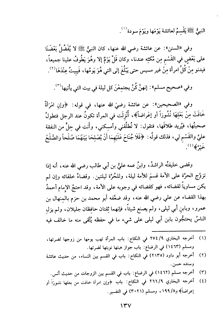 وَقَضَى خَلِيفَتُهُ الرَّاشِدُ وَابْنُ عَمِّهِ عَلِيُّ بْنُ أَبِي طَالِبٍ رَضِيَ اللَّهُ عَنْهُ، أَنَّهُ إِذَا تَزَوَّجَ الْحُرَّةَ عَلَى الْأَمَةِ قَسَمَ لِلْأَمَةِ لَيْلَةً، وَلِلْحُرَّةِ لَيْلَتَيْنِ.