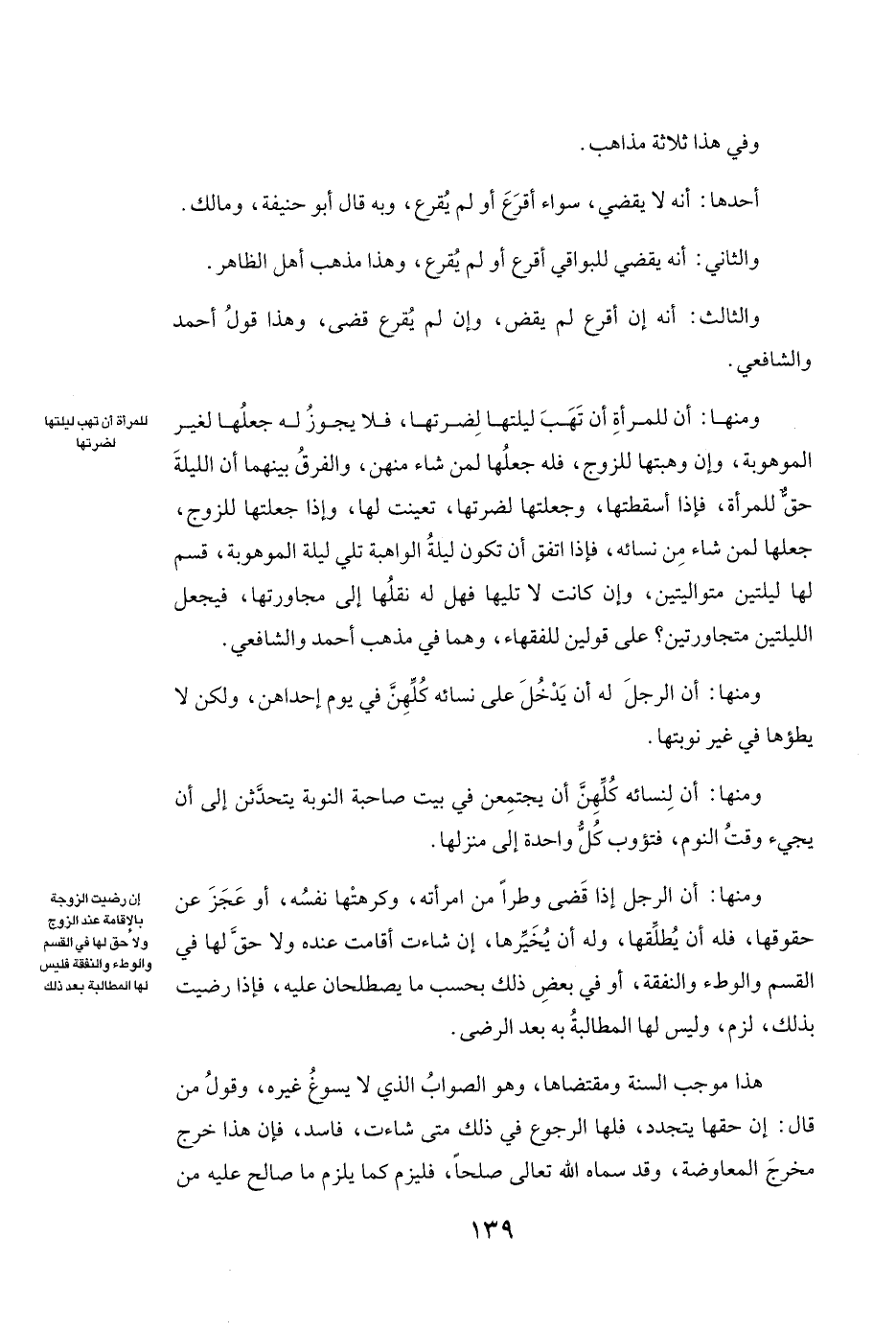 وَمِنْهَا: أَنَّ لِلْمَرْأَةِ أَنْ تَهَبَ لَيْلَتَهَا لِضَرَّتِهَا، فَلَا يَجُوزُ لَهُ جَعْلُهَا لِغَيْرِ الْمَوْهُوبَةِ، وَإِنْ وَهَبَتْهَا لِلزَّوْجِ، فَلَهُ جَعْلُهَا لِمَنْ شَاءَ مِنْهُنَّ، وَالْفَرْقُ بَيْنَهُمَا أَنَّ اللَّيْلَةَ حَقٌّ لِلْمَرْأَةِ فَإِذَا أَسَقَطَتْهَا وَجَعَلَتْهَا لِضَرَّتِهَا تَعَيَّنَتْ لَهَا، وَإِذَا جَعَلَتْهَا لِلزَّوْجِ جَعَلَهَا لِمَنْ شَاءَ مِنْ نِسَائِهِ، فَإِذَا اتَّفَقَ أَنْ تَكُونَ لَيْلَةُ الْوَاهِبَةِ تَلِي لَيْلَةَ الْمَوْهُوبَةِ، قَسَمَ لَهَا لَيْلَتَيْنِ مُتَوَالِيَتَيْنِ، وَإِنْ كَانَتْ لَا تَلِيهَا فَهَلْ لَهُ نَقْلُهَا إِلَى مُجَاوَرَتِهَا فَيَجْعَلُ اللَّيْلَتَيْنِ مُتَجَاوِرَتَيْنِ؟ عَلَى قَوْلَيْنِ لِلْفُقَهَاءِ وَهُمَا فِي مَذْهَبِ أَحْمَدَ وَالشَّافِعِيِّ.