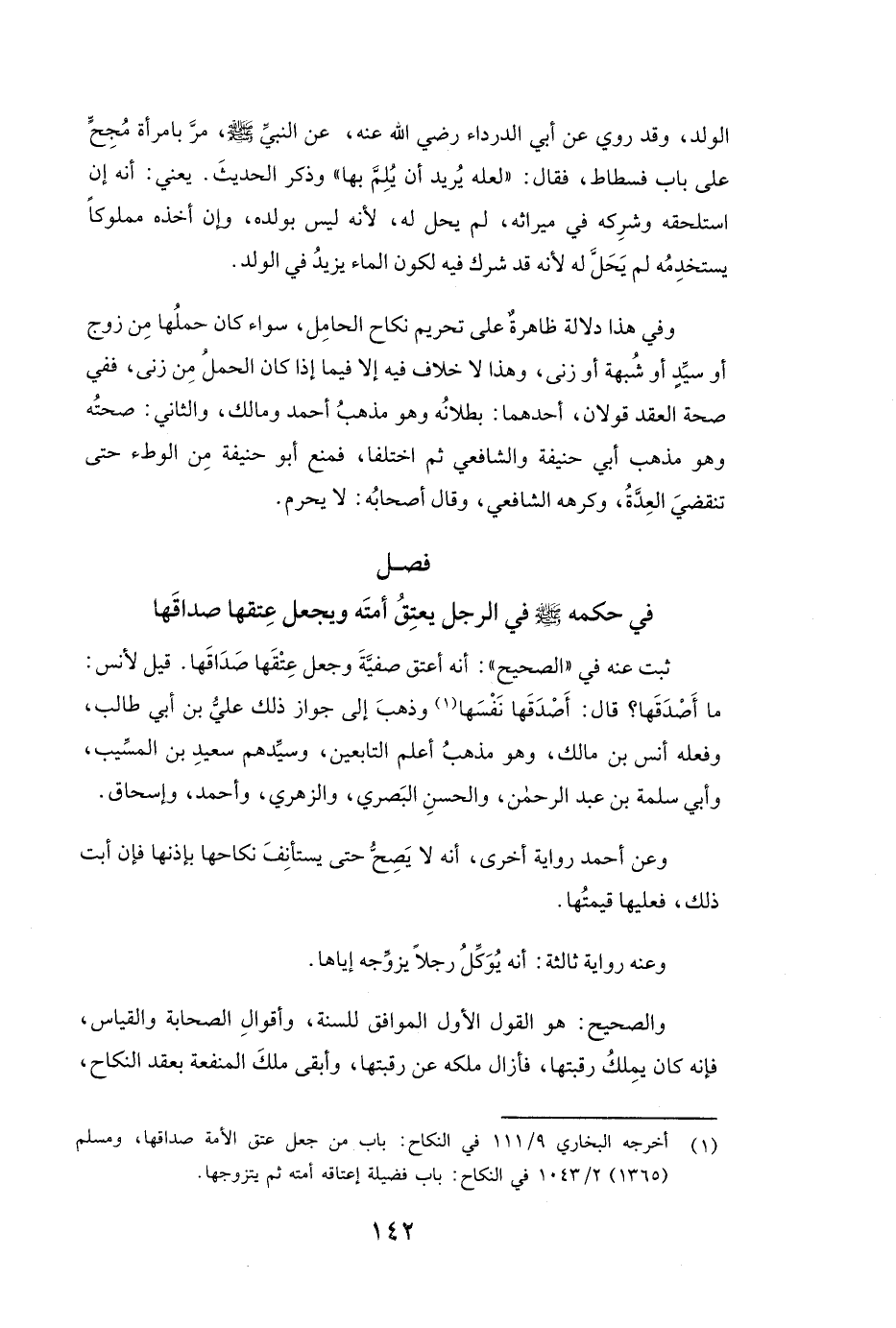 وَالصَّحِيحُ هُوَ الْقَوْلُ الْأَوَّلُ الْمُوَافِقُ لِلسُّنَّةِ وَأَقْوَالِ الصَّحَابَةِ وَالْقِيَاسِ، فَإِنَّهُ كَانَ يَمْلِكُ رَقَبَتَهَا فَأَزَالَ مِلْكَهُ عَنْ رَقَبَتِهَا وَأَبْقَى مِلْكَ الْمَنْفَعَةِ بِعَقْدِ النِّكَاحِ